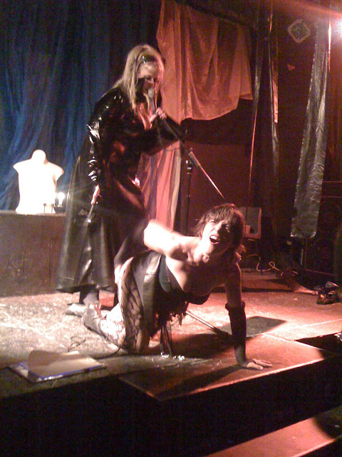 One lady in red rubber kept asking for my email and saying she wanted a young slave: a) I’m not particularly young and b) I’m not gay. I felt a kind of cruel contempt towards her arising within me (what’s that about? answers please). Some other trussed up women kept trying to drag me on stage. At that point my evil dom side came out and threw the more insistent one on the floor. I think she enjoyed it though! Great thing about people in very high heels, they are so easy to topple over.