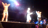 On stage the whipping demonstration started. Two girls stood either side while a man in camouflage showed skill and accuracy with his whip, curling it around their waists and spinning them. I got told off for taking a picture. You can’t identify these girls. Five minutes later one came down showing off her bloody welts and I didn’t recognize her with her clothes on.