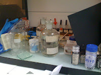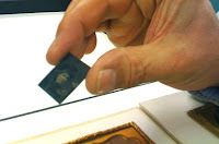 Getty conservation team consists of one man only: he has to be creative. Given glass plates of Eva Peron, which had been ruined by reticulation (1), he painstakingly soaked each plate in a solution, floated off the thin membrane of silver gelatine containing the image, and placed it carefully on a new pane of glass. Each plate took 5 hours.