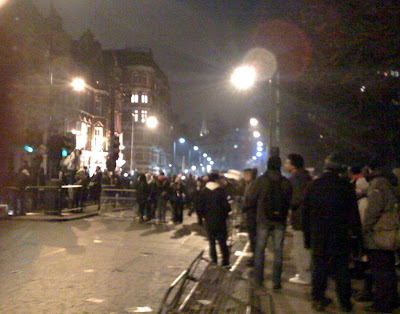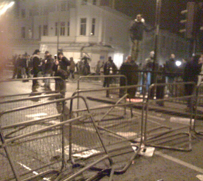 As it grew dark, Muslim teenagers dragged the barricades across the road and started to throw sticks. Intifada in Kensington? Police on horseback moved towards us threateningly, but horses are helpless against barriers. Riot police heaved.