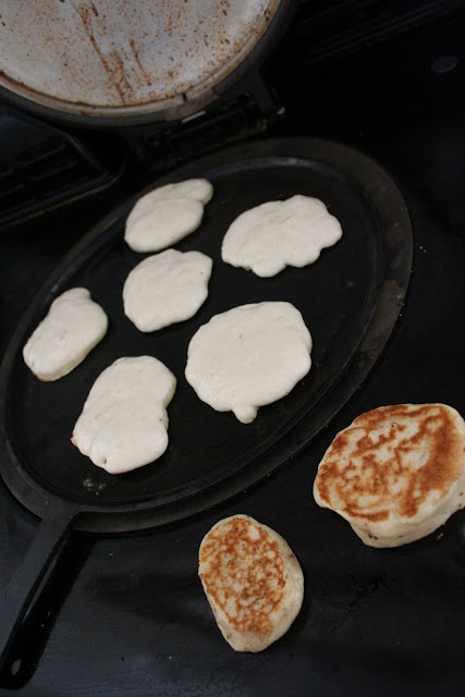 After making the mix and leaving it to rise, I dropped dollops of the crumpet mixture on the simmering plate of the Aga. Do not turn it over until bubbles start to show in the top. The bubbles then burst and you have the characteristic crumpet holes, not as many as in shop bought ones however. After about five minutes flip it over and lightly brown the other side. I added more salt to the mixture than the recipe suggests.