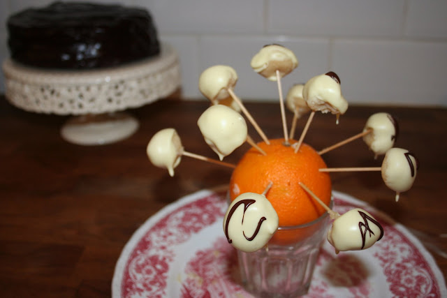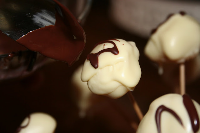 You dip the sticks into white chocolate, then trickle dark chocolate over the balls