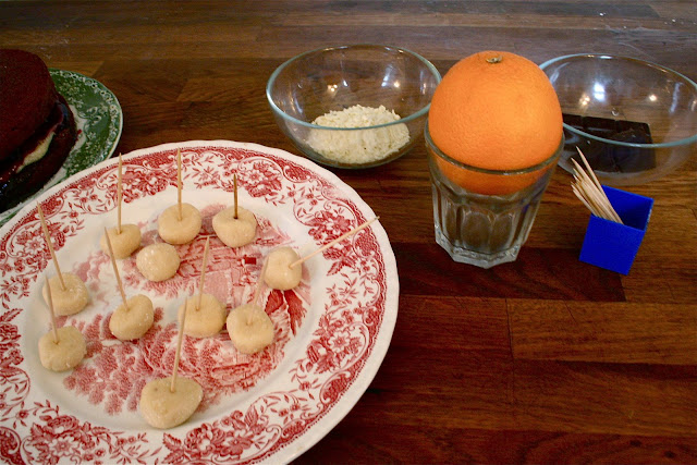 The home-made marzipan balls for the chocolate simnel cake. Jam an orange into a glass to prepare the balls.