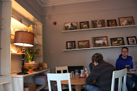 The Crown pub has a felicitous location, overlooking the fountains and wrought iron gates of Victoria Park in London’s East End. The upstairs has been transformed into a gastropub-style dining room, painted in French grey, with a dresser, vintage china, a shabby-chic mix of scrubbed pine tables and black and white photographs on the wall.