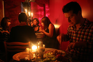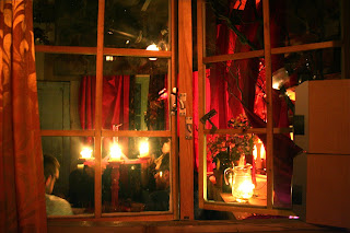 An alleyway in Dalston, Sunday evening, 7.30 pm prompt: a giant man with a red bowtie opens the pale blue door. You enter set designer Tony Hornecker’s magical workshop, part home restaurant, part cabaret. Strangely proportioned with tiny windows, large doors, rickety windy staircases, small tables perched on balconies, it’s like opening a chapter of Alice in Wonderland. Or perhaps one of the more psychedelic episodes of The Avengers…stopped clocks, freaky dolls, candlelight, toy prams stuffed with knitting in progress, red velvet tented ceilings. Lighting is kept low and flattering, fellow guests shimmy in pearls and little black dresses. The atmosphere is breathy, close, claustrophic almost.