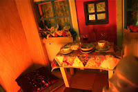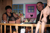 Everywhere you looked was full of character, decorated dolls houses, chandeliers, gilt mirrors, fisheye port-holes, odd sayings chalked on little blackboards, lacy curtained windows. Crockery was vintage and mixed. I noted hand-made cloth serviettes in different fabrics, run up by Tony himself. There was attention to detail, atmosphere and warmth.