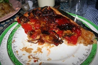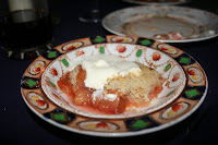 The food was simple but tasty. A greek salad with good quality feta cheese and warm pitta to start. My vegetarian option for mains was a kind of pissaladière tart, puff pastry topped by caramelised onions and tomatoes. My companion had beef slices, perfectly cooked. These were accompanied by buttery new potatoes and Savoy cabbage. Dessert was rhubarb crumble and cream. Half a bottle of wine is included.