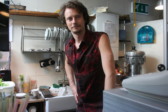 You go through the shop to the back where there are a few tables scattered in the messy courtyard. Some nice hippies behind the counter take your order, you pay, then you sit down.