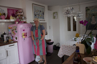 In suburban Sheen, not as far as you think, there is a little house painted pink where Lara Newman cooks. If Katie Jordan Price cooked (don’t think she does, do you?) her kitchen would probably resemble Lara’s; pink Smeg fridge, pink Smeg dishwasher, pink Kitchen aid mixer, pink kettles, coffee pots, knives, drainer…well you get the picture. There are also many examples of knitted cupcakes: it’s as if the psychedelic sweetness of Alice in Wonderland were dipped in pink dye.