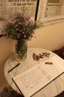 Bottom: The guest book, I’m trying to get an email list together (rather belatedly) and Michaelmas daisies from my garden.