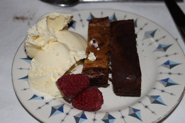 White chocolate & & chilli blondie & a chocolate brownie with homemade vanilla ice cream.