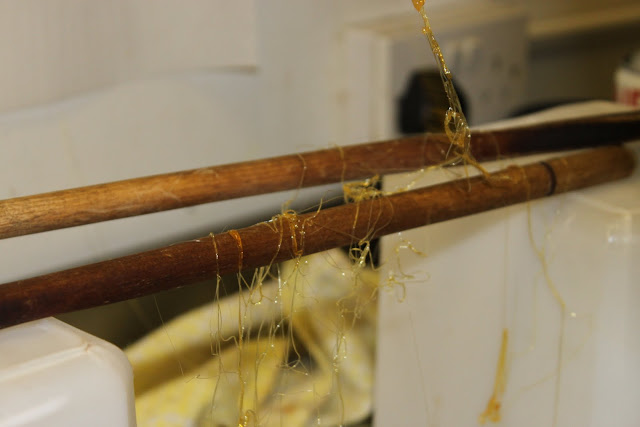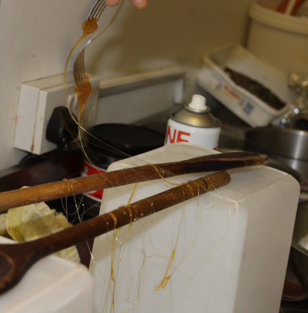 However I am posting here Bea’s advice…just be careful and cover all of your surfaces with greaseproof paper, clingfilm, oil spray or wipe with a rag dipped in oil. Hide the dog and the kids. Molten sugar gets everywhere.