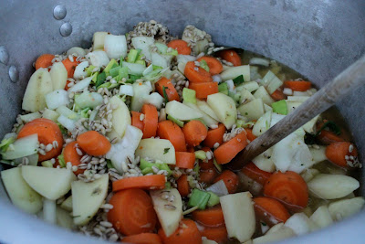 Carrots, onions, leeks, pearl barley, butterbeans and various strange spices such as juniper berries, mace and all spice.