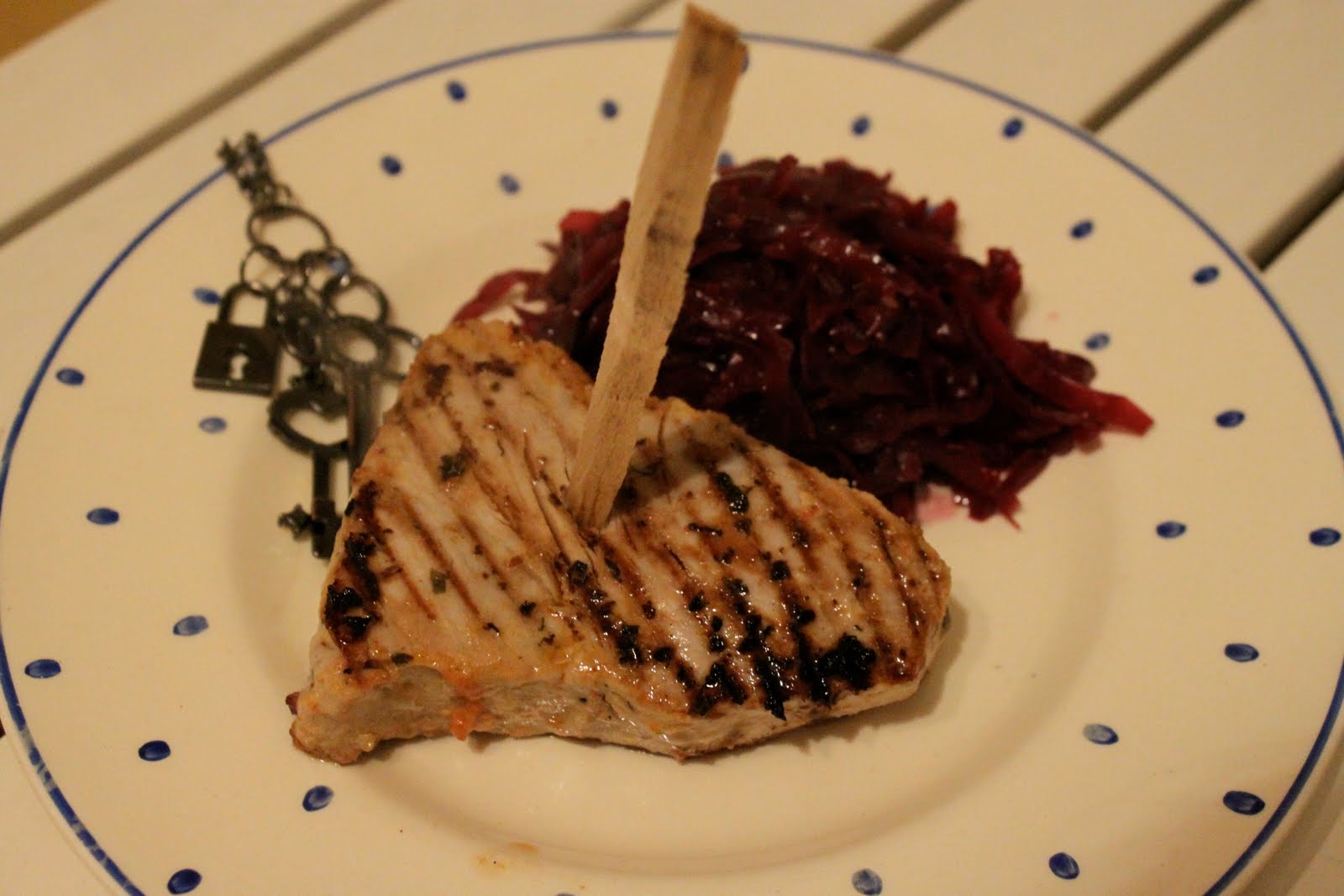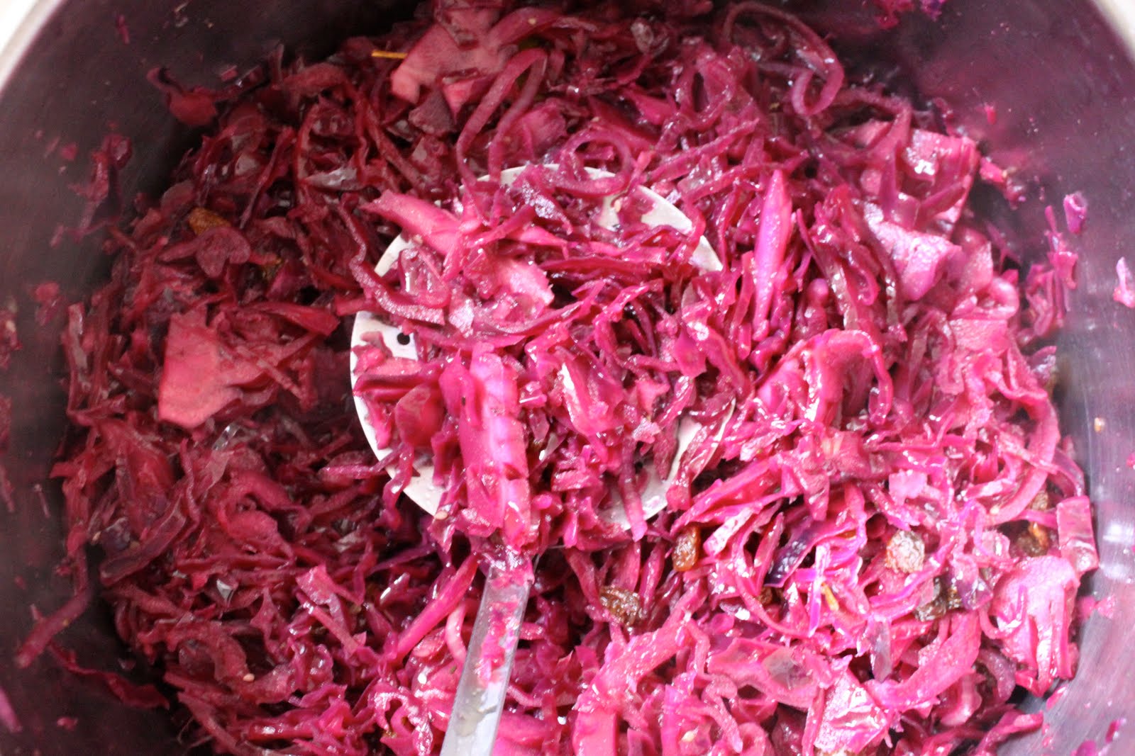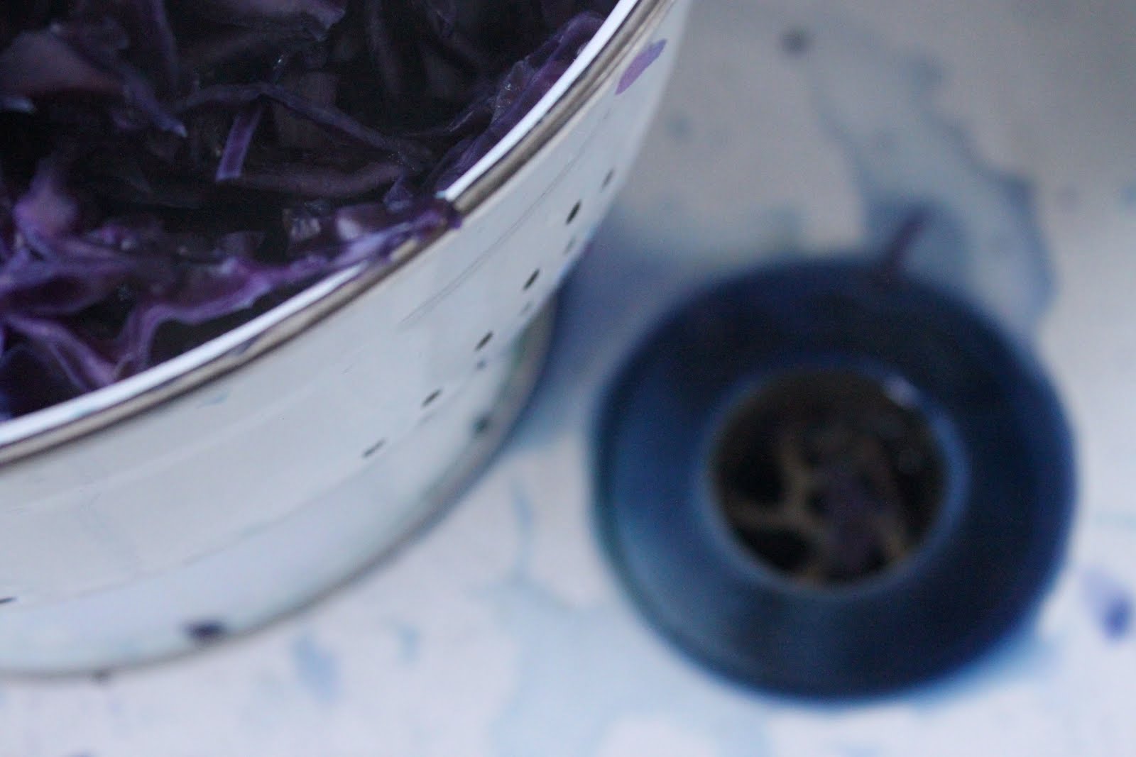 Blanching the red cabbage…at first it’s blue because of the anthocyanins