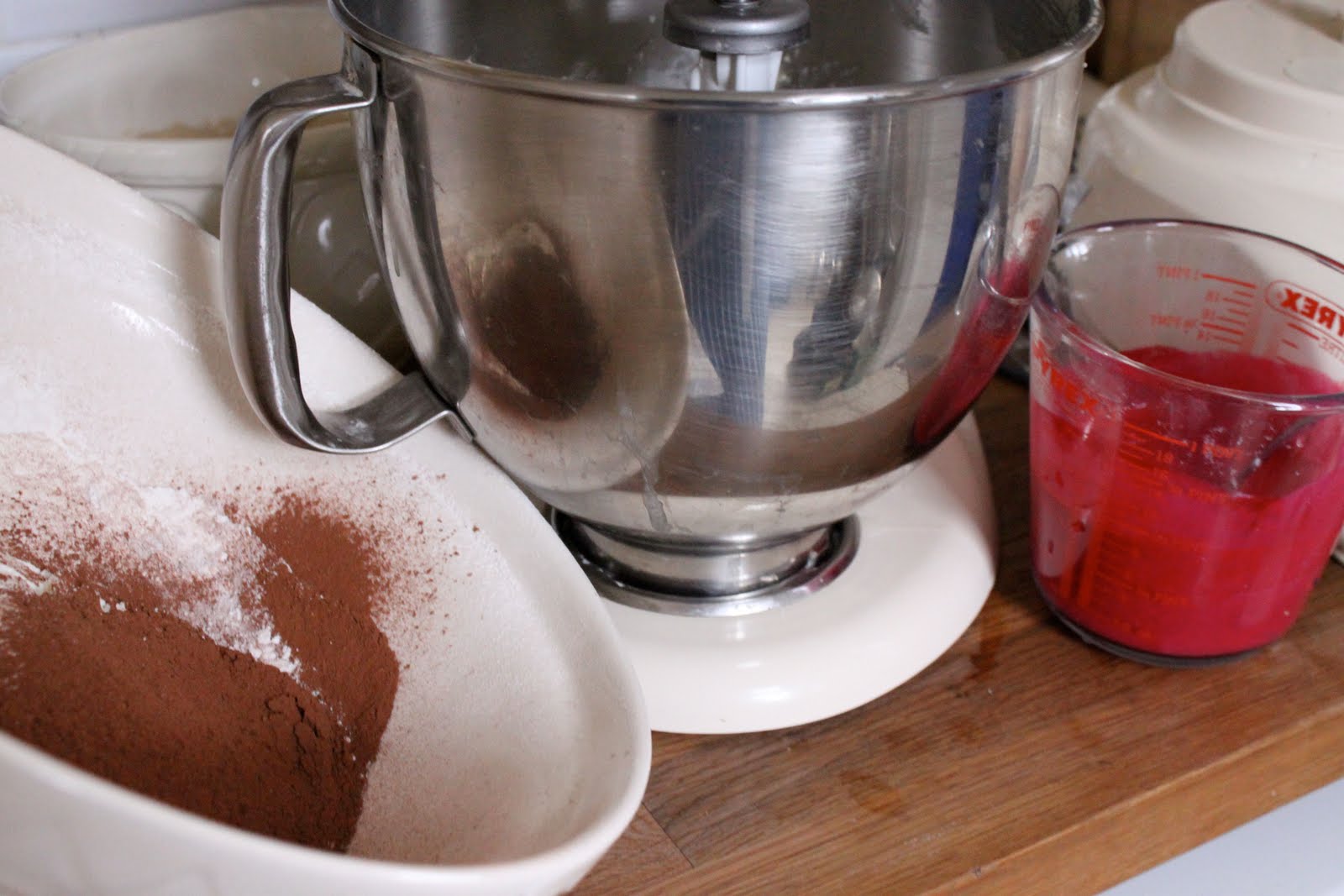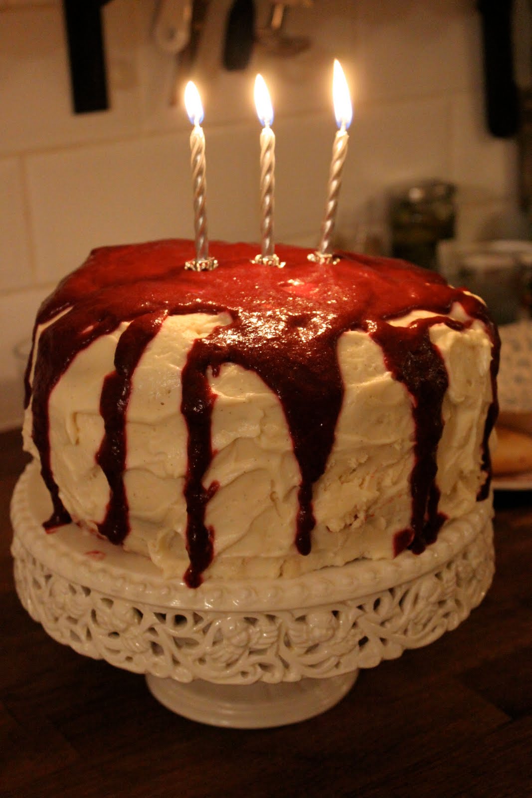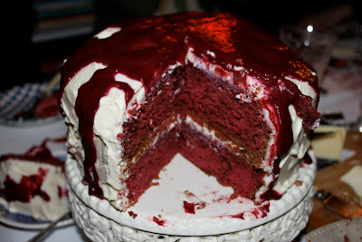 Menu Very spicy True Bloody Mary (with fresh grated horseradish) Garlic focaccia shots with Roasted tomato soup Open ravioli with pepperonata, red pesto and goat’s cheese Tuna ‘stake’ with red cabbage confit Welsh cheese board from Moelfaban supperclub and charcoal biscuits with chutney from House of Chutney I know what you did last summer pudding (pink rhubarb and forest fruit) Red Velvet birthday cake (a particular triumph)with Blackcurrant curd topping by The Laundry Douwe Egberts Velvet blend coffee and red glitter chocolates from Suki & Me A vampire menu, dominant colour red. Quite tricky, making fresh pasta ravioli then searing tuna for 26 covers simultaneously. Many of the guests from this private party worked in the opera, one loved that my waitress was called Aida. The bathroom was dominated by people drenching themselves in blood, applying their fangs. I did my research, read one of the True Blood books…it’s Jackie Collins meets Anne Rice. Not a bad thing.