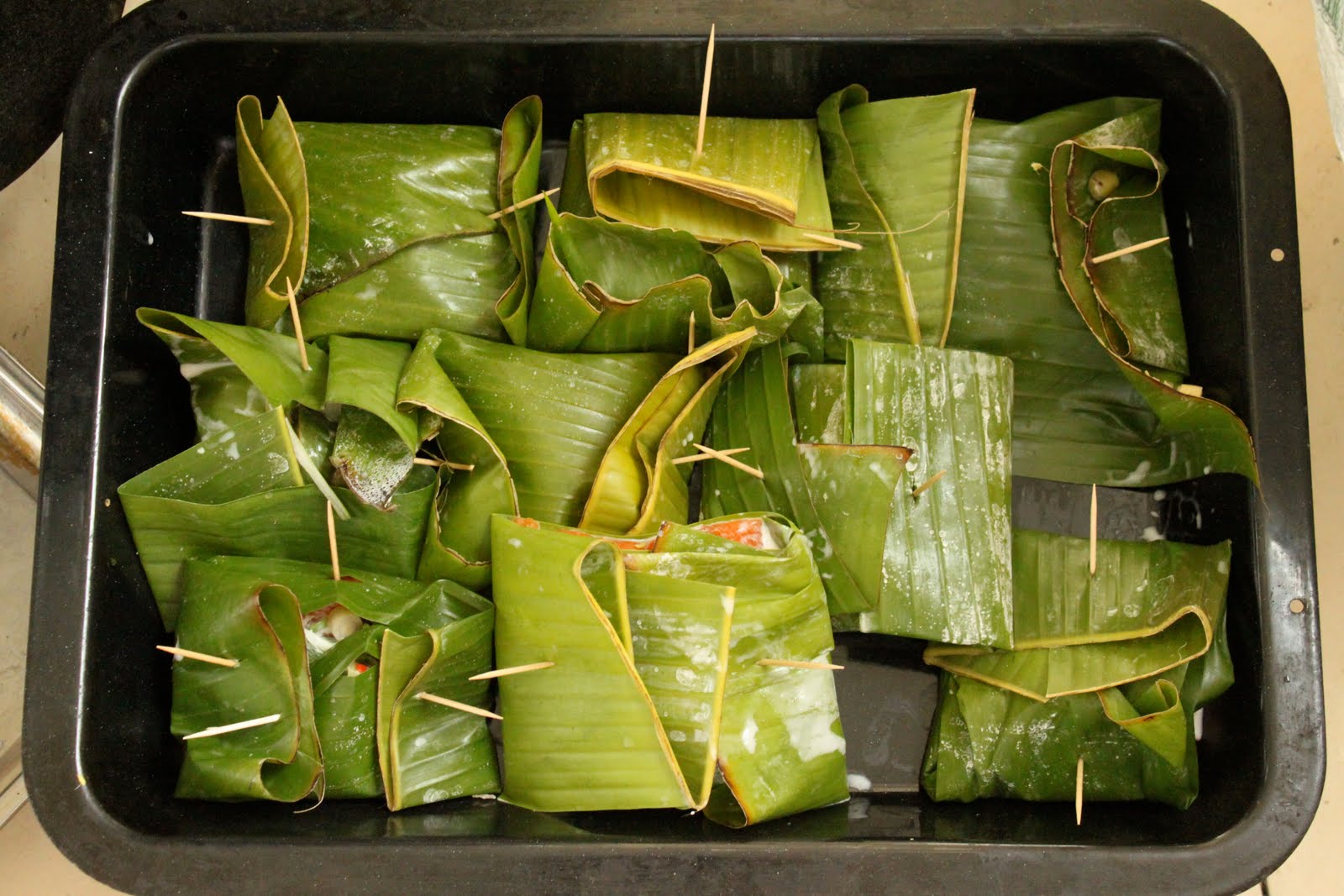 Trout baked in banana leaves, Thai style