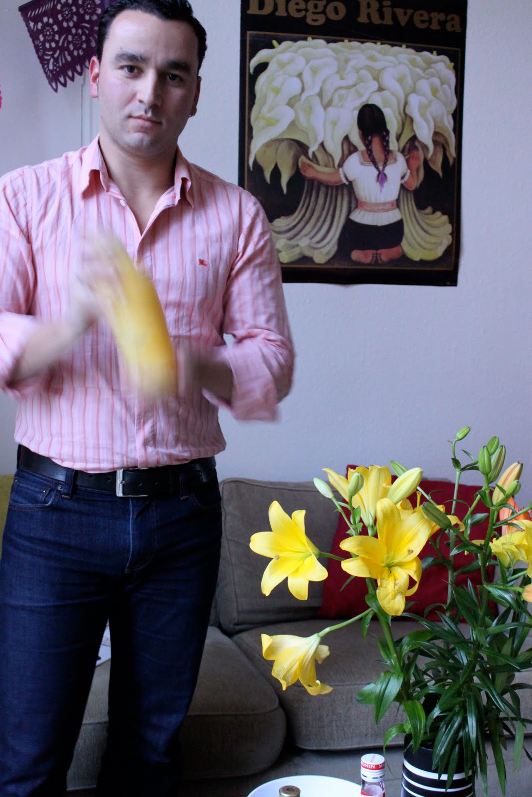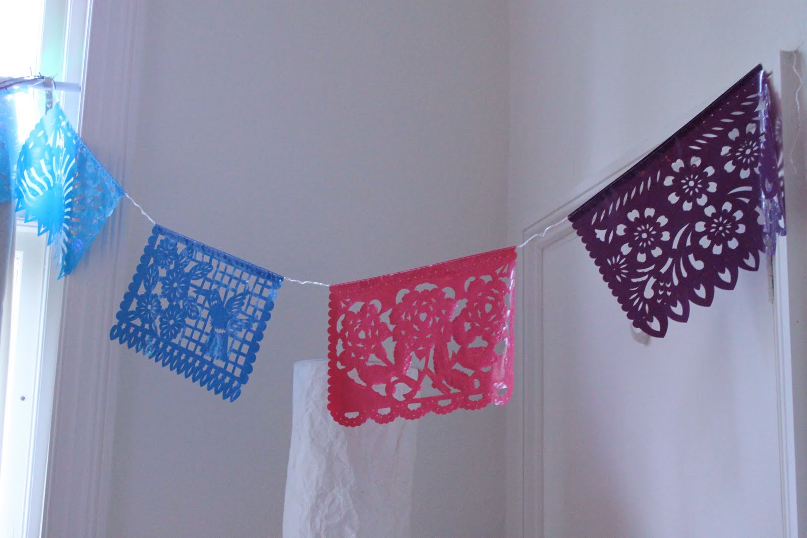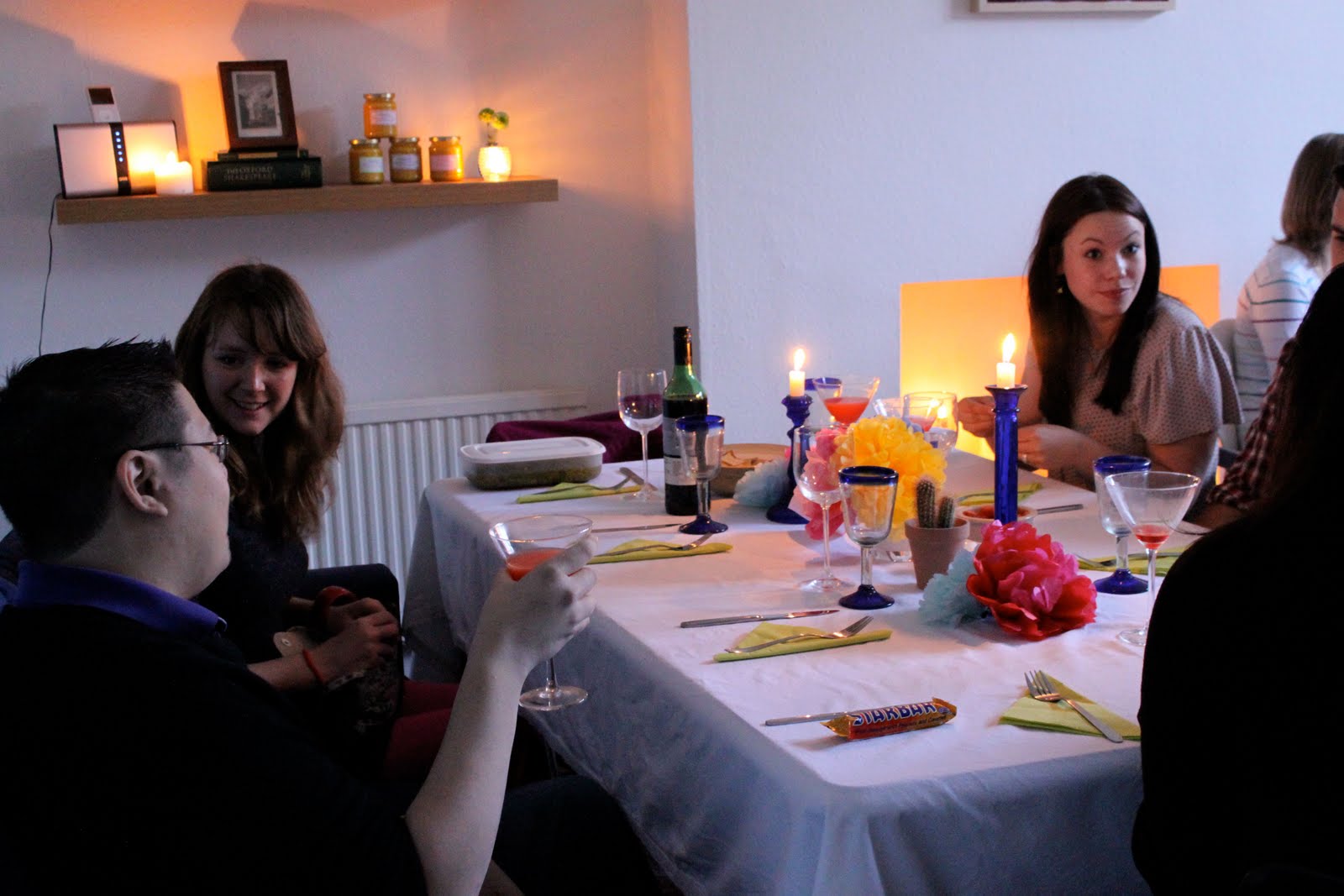 This evening, el cinco de Mayo, a holiday that celebrates an unlikely battle victory over the French during their occupation of Mexico, myself and 12 other guests were treated to a Mexican menu. Bright paper decorations, handmade by Lesley, her flatmate, graced the tables, Tequila Sunrise cocktails were shaken by Carla’s other flatmate.