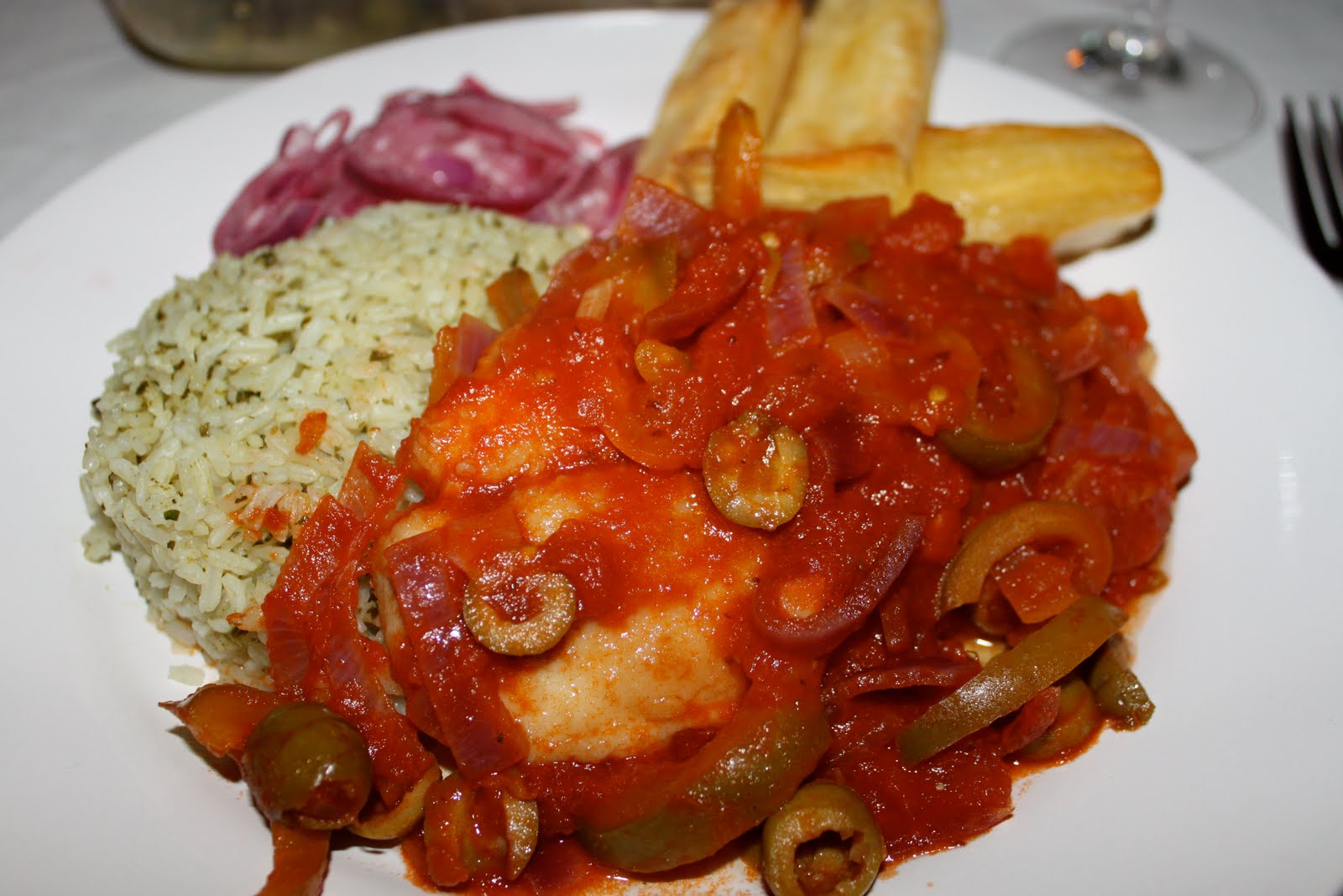 Main course of yuca chips, fish in an umami rich olive, pepper and tomato sauce (a la vercruzana) with green rice and a delicious onion salad (pickled in lime juice).