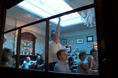 We looked at the chart for the match: I can’t remember the details due to drinking two pints of lager (I’m a cheap date and I was trying to get into the swing of things) and hopefully Bethea will post more on her blog (Sybil’s Boudoir) about it. My first impression of the chart is that England’s main opponent was not so much Slovenia, but the expectations and hopes of people back in England.