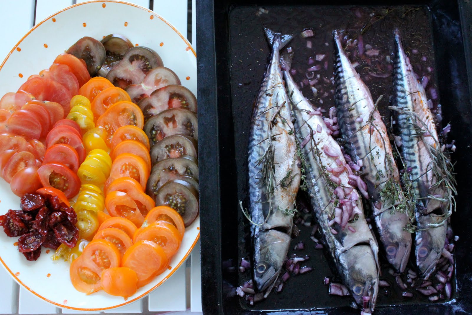 Heritage tomato salad and marinated mackerel in my own red wine vinegar