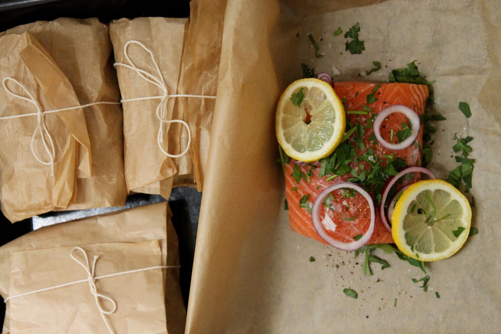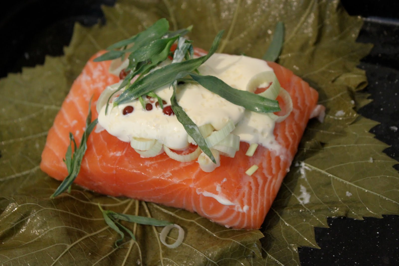 Salmon with wet garlic, tarragon, creme fraiche in vine leaves