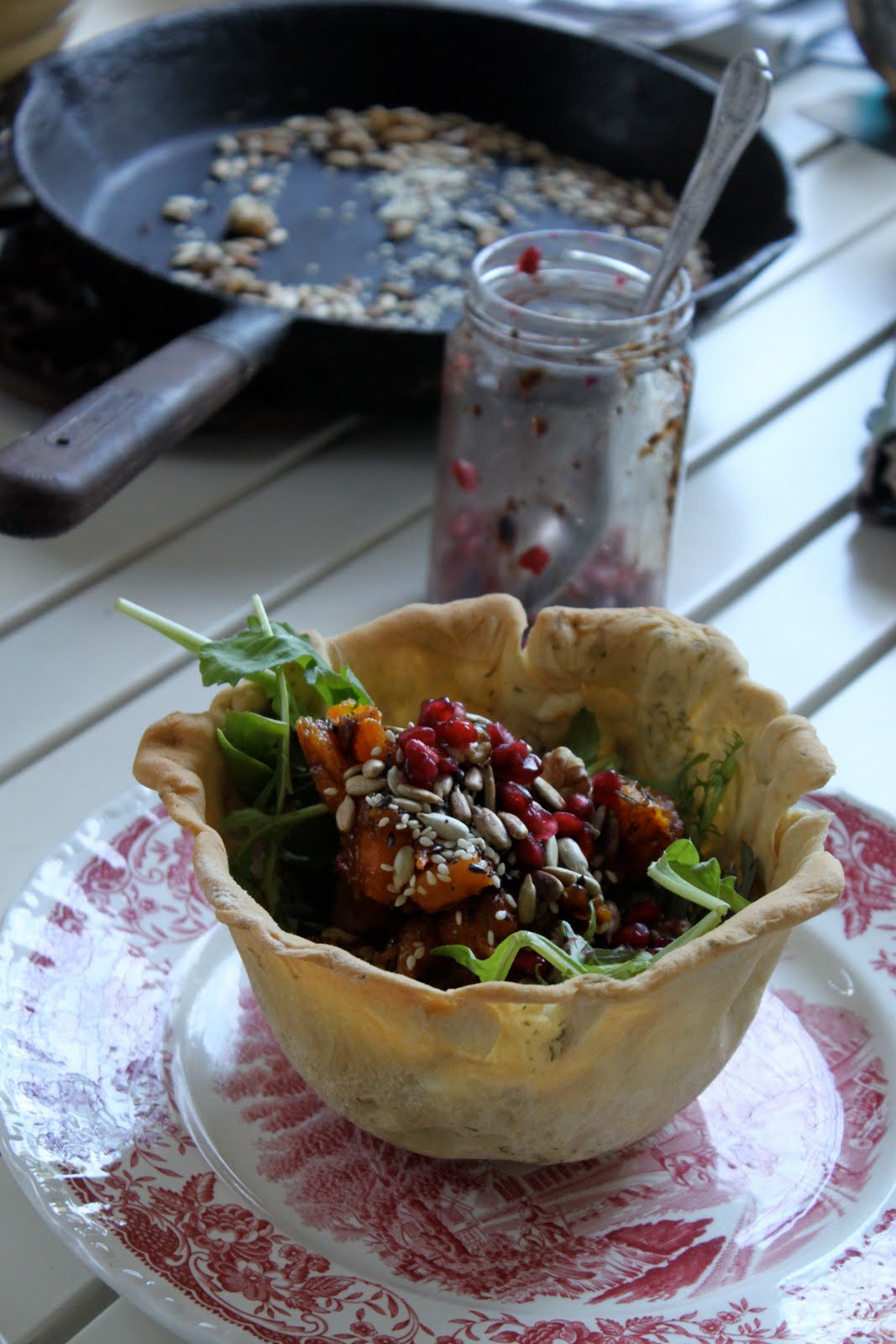 I put an Ottolenghi style salad with roasted butternut squash, pomegranate seeds and syrup, roasted seeds, inside