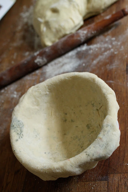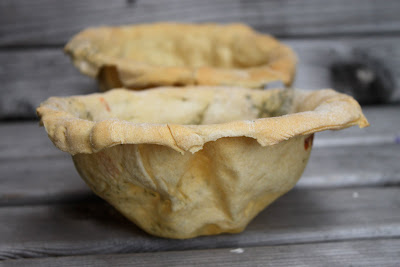 Do normal focaccia dough, oil the inside of an ovenproof bowl, drape the thinly rolled out dough making sure there are no bubbles and bake for 30 minutes