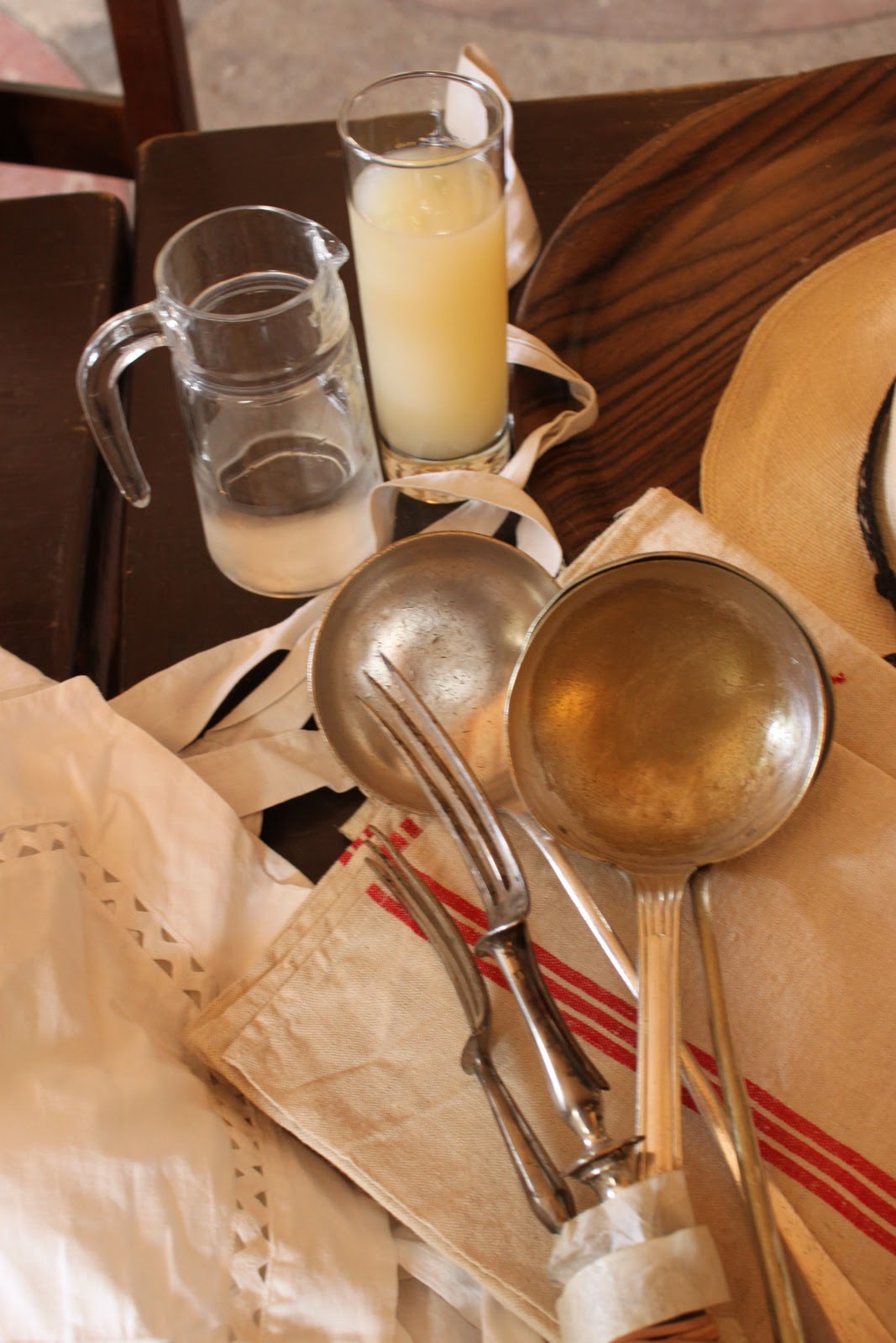 My buys this week: three silver plated ladles and two fork for 10 euros; two vintage linen tea towels, 5 euros each; a dozen vintage aprons 30 euros. And a refreshing Pastis up at the bar when I’d finished. Thirsty work!