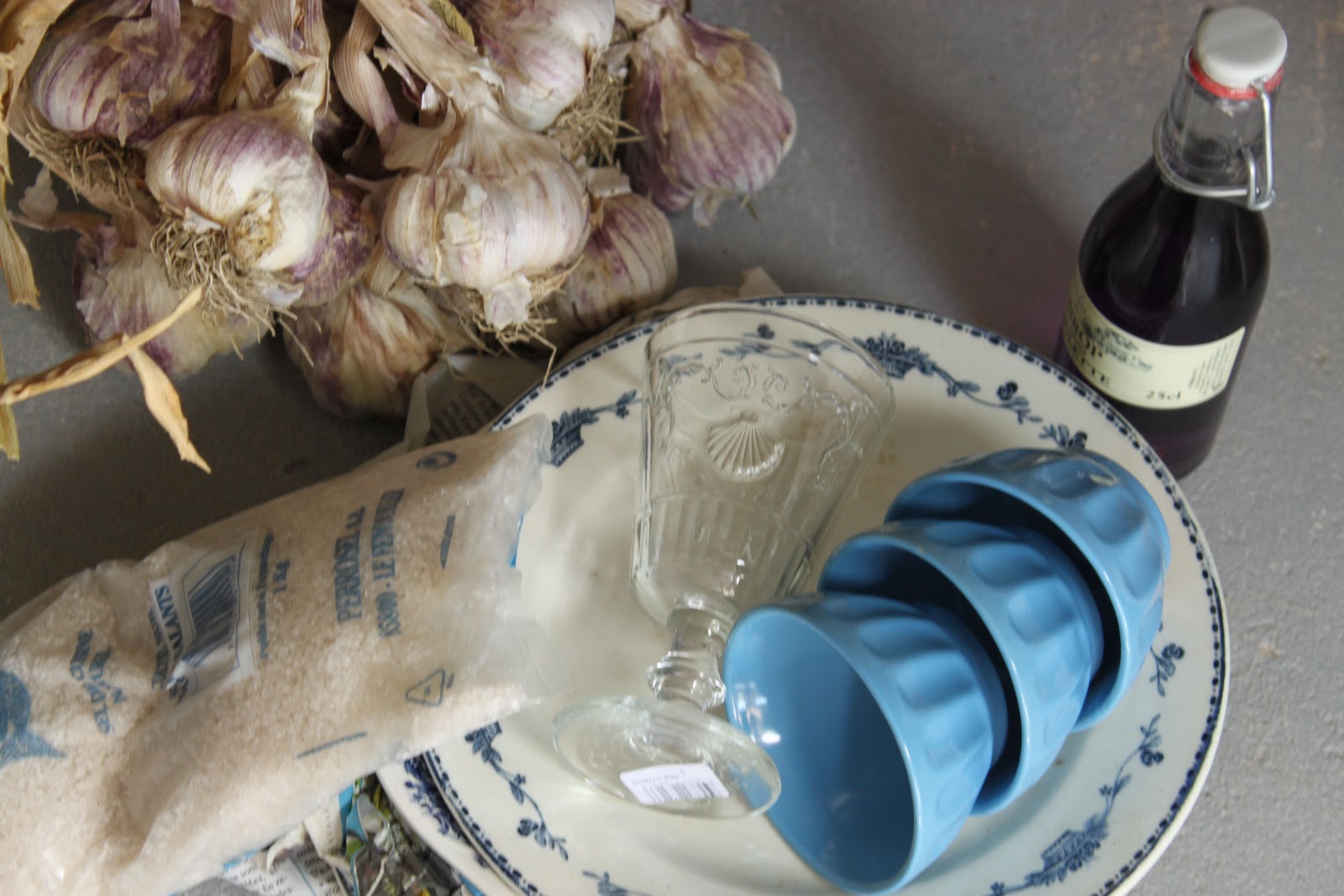 Some more buys: violet syrup, gros sel (always buy some when in France), vintage blue and white plates, a euro each, little blue bowls, modern, 1.5 euros each, glass from La Rochere and garlic called ‘ail violet’ which should last up to a year.