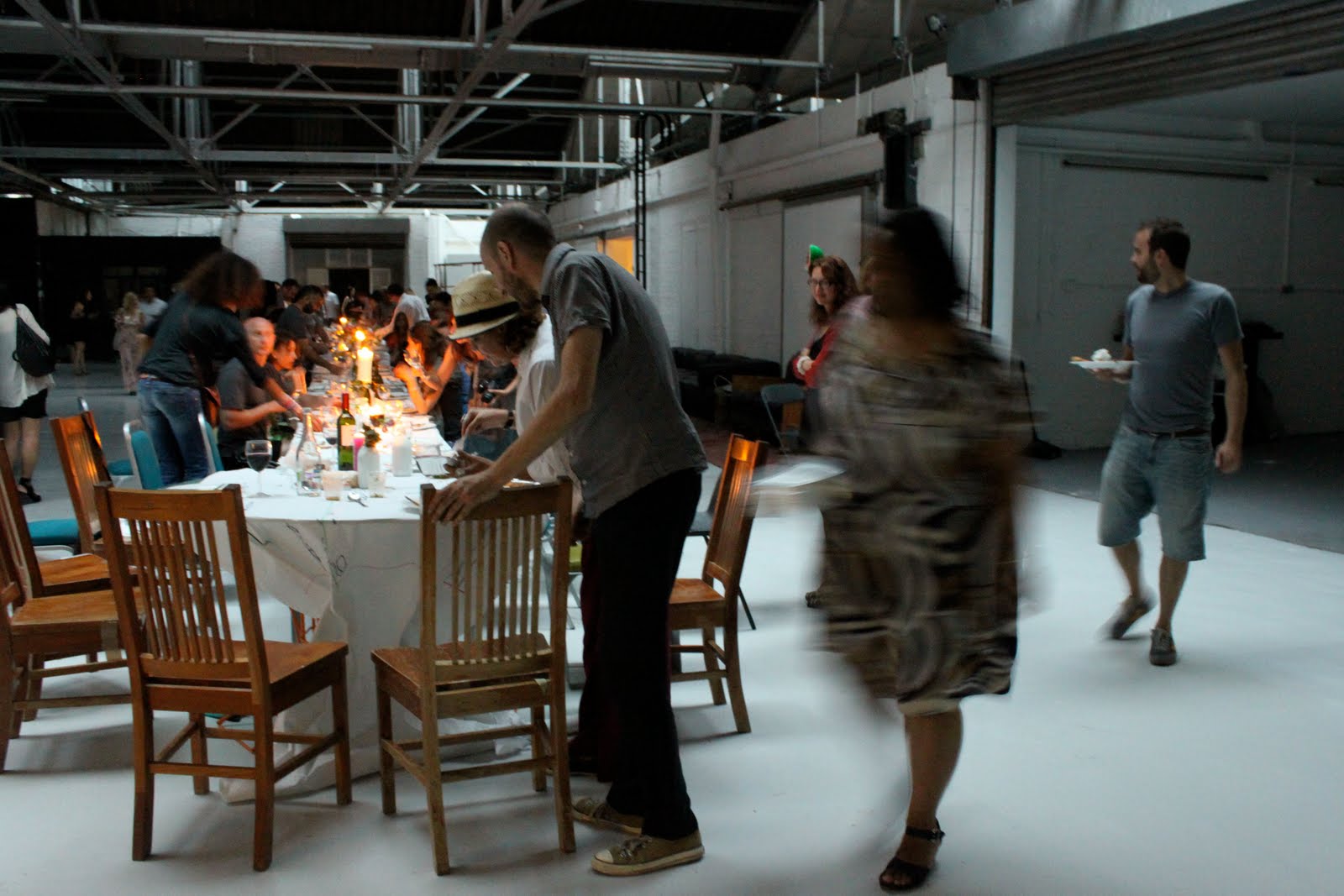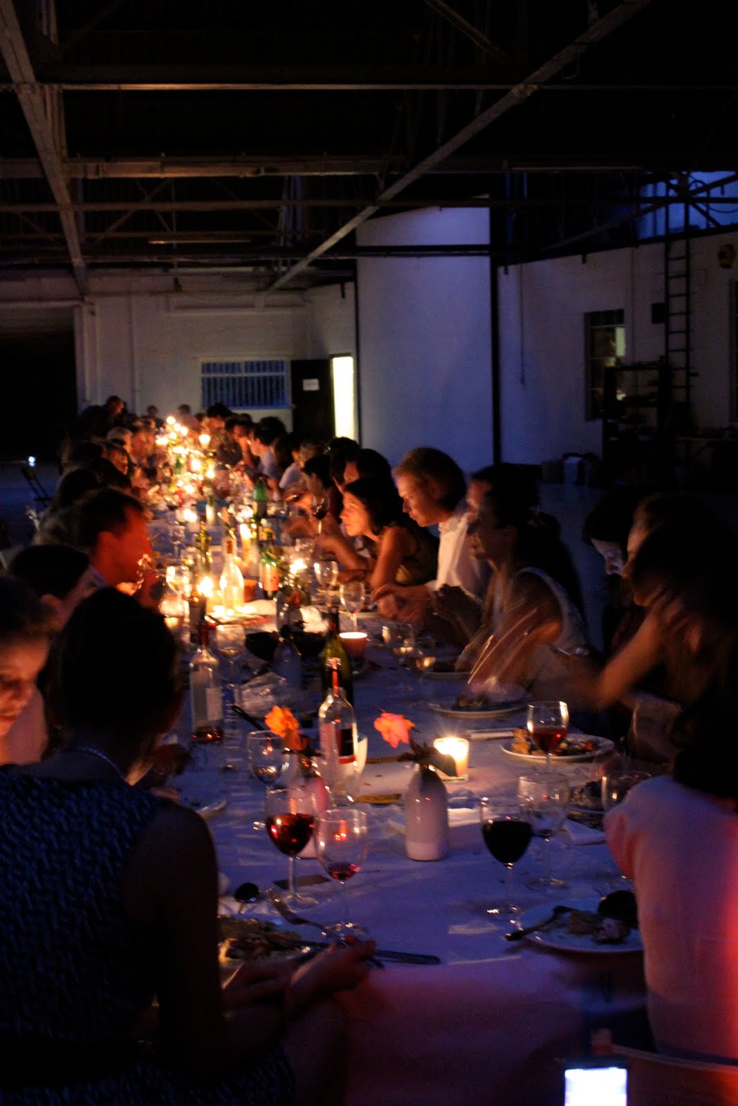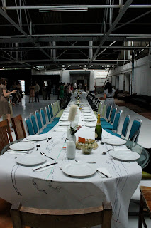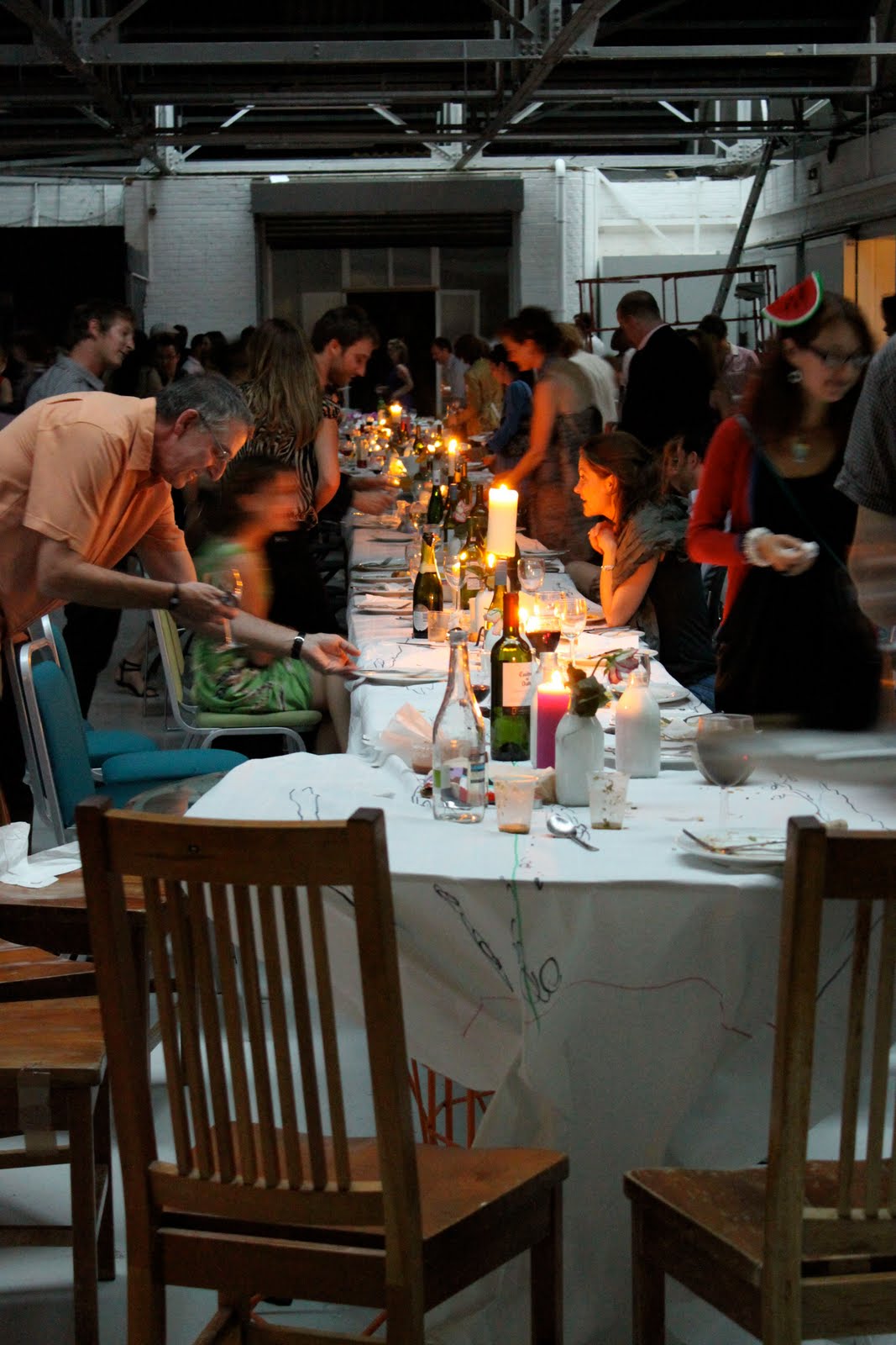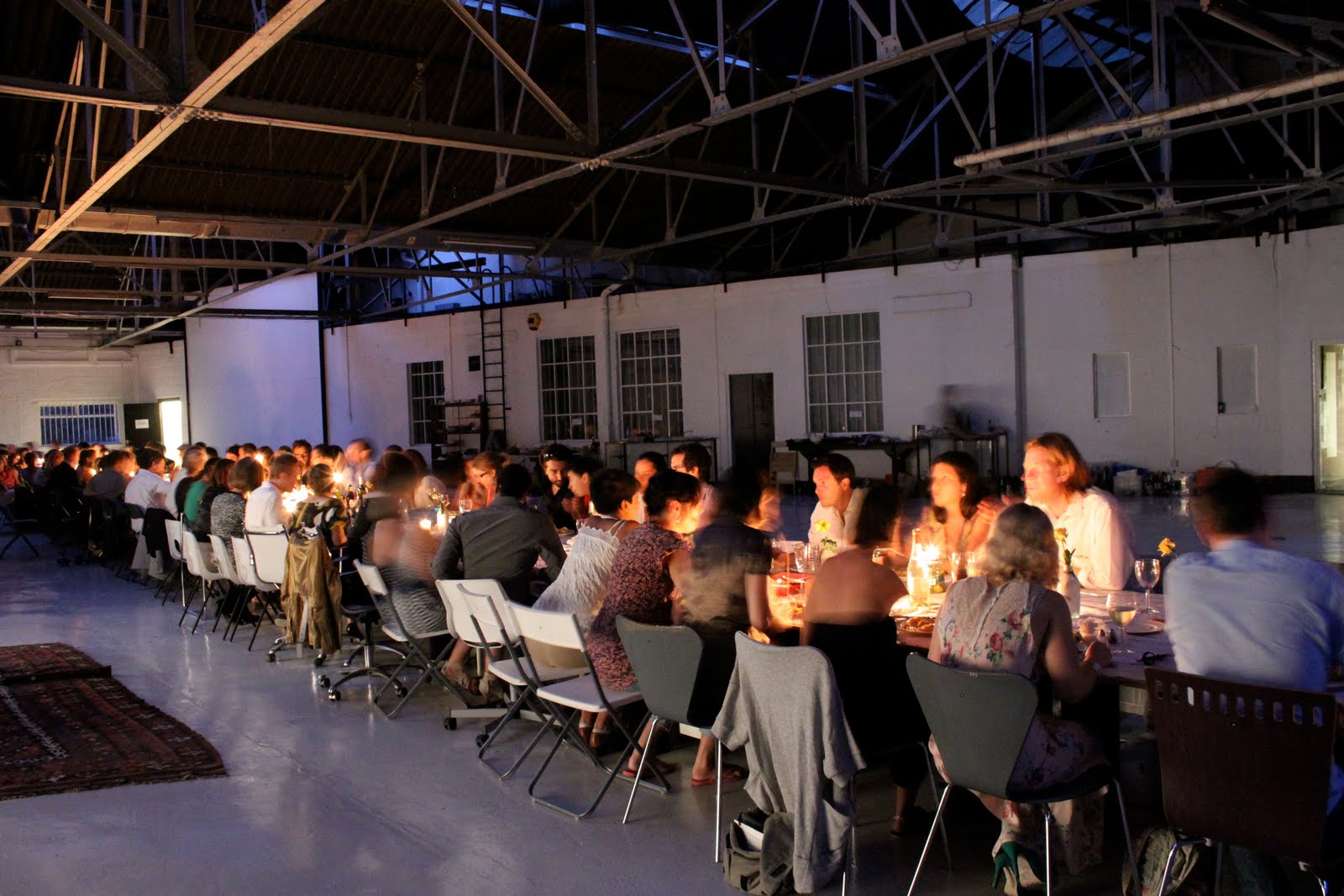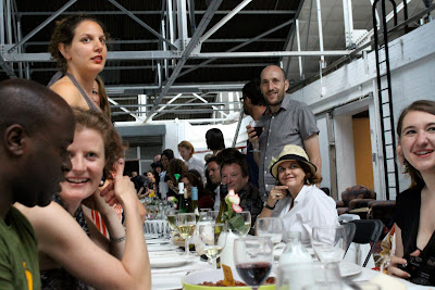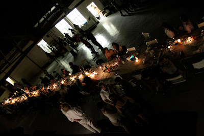 Alex Haw, organiser of Latitudinal cuisine, a weekly supper club where guests bring a dish, borrowed a large space at The Dairy in Kings Cross. He invited 100 guests, who were told to bring a dish from their country and a candle. Sourcing a thirty metre table and 100 chairs was no mean feat. The candles were lit as the light dimmed on a warm July day. Guests were given numbers three times during the meal, we changed places by seeking the corresponding number on the back of the chair.