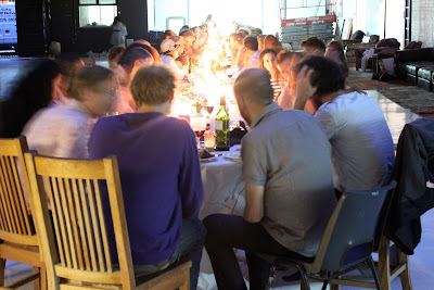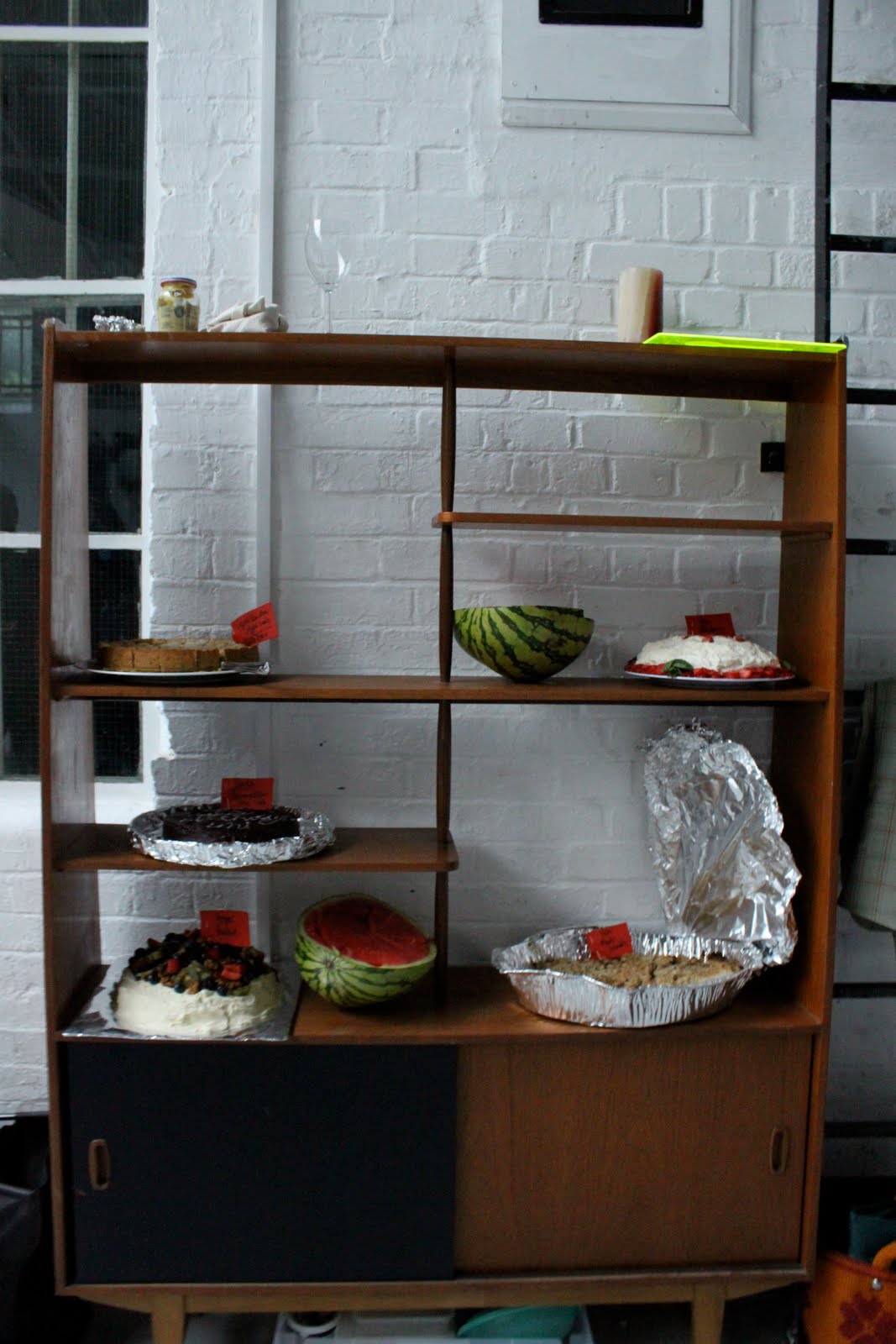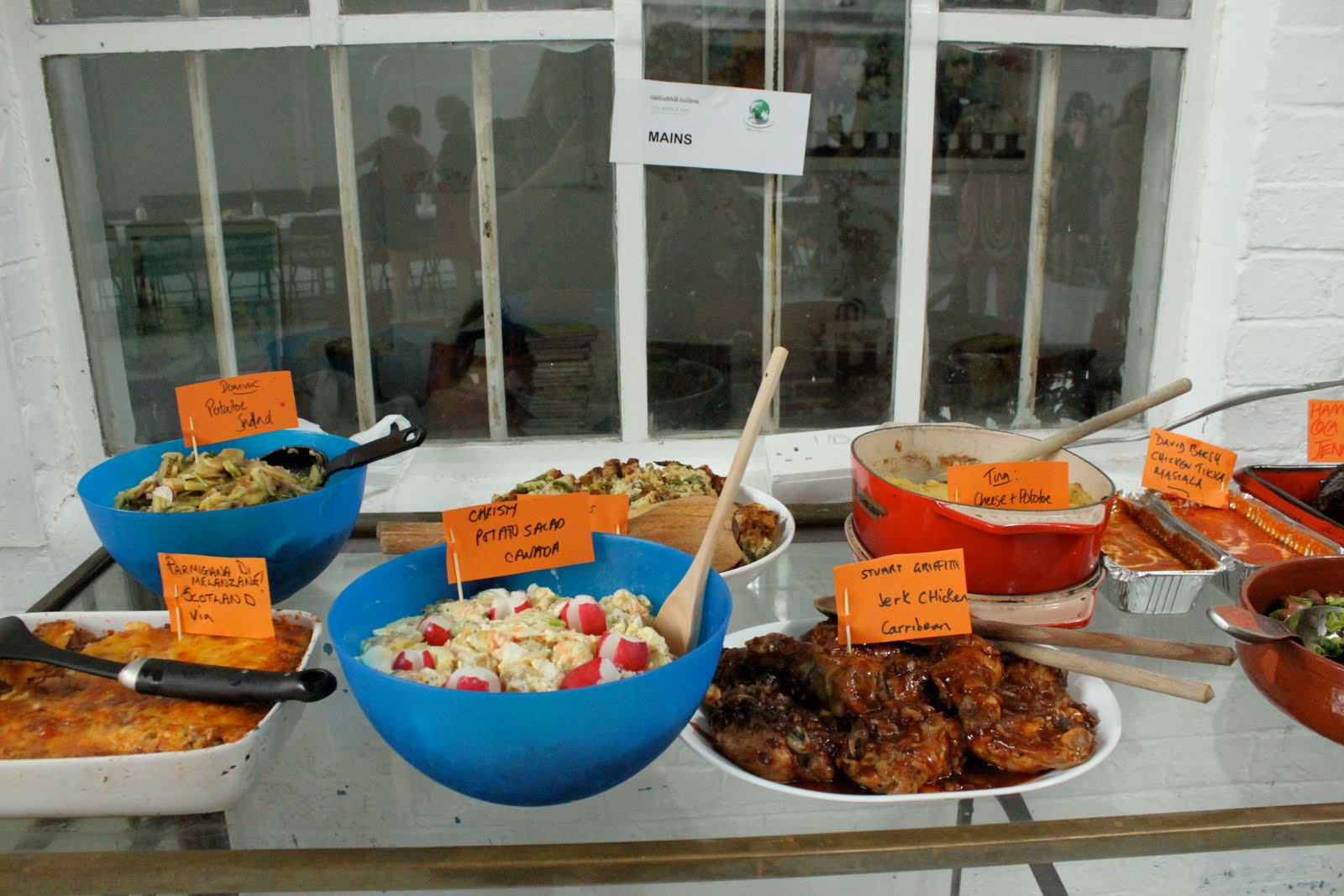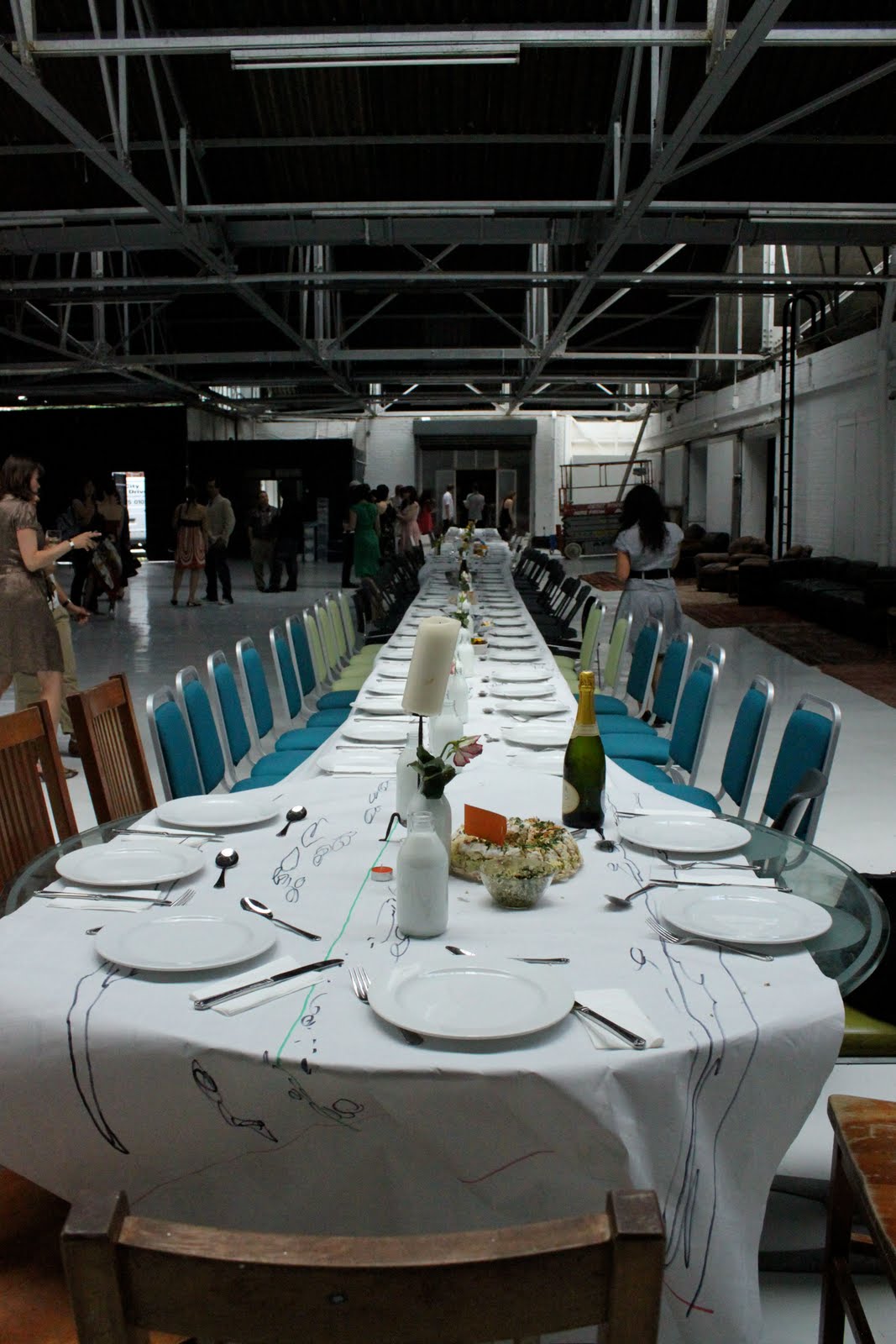 Alex Haw, organiser of Latitudinal cuisine, a weekly supper club where guests bring a dish, borrowed a large space at The Dairy in Kings Cross. He invited 100 guests, who were told to bring a dish from their country and a candle. Sourcing a thirty metre table and 100 chairs was no mean feat. The candles were lit as the light dimmed on a warm July day. Guests were given numbers three times during the meal, we changed places by seeking the corresponding number on the back of the chair.