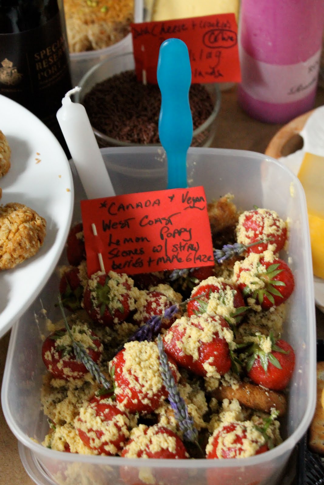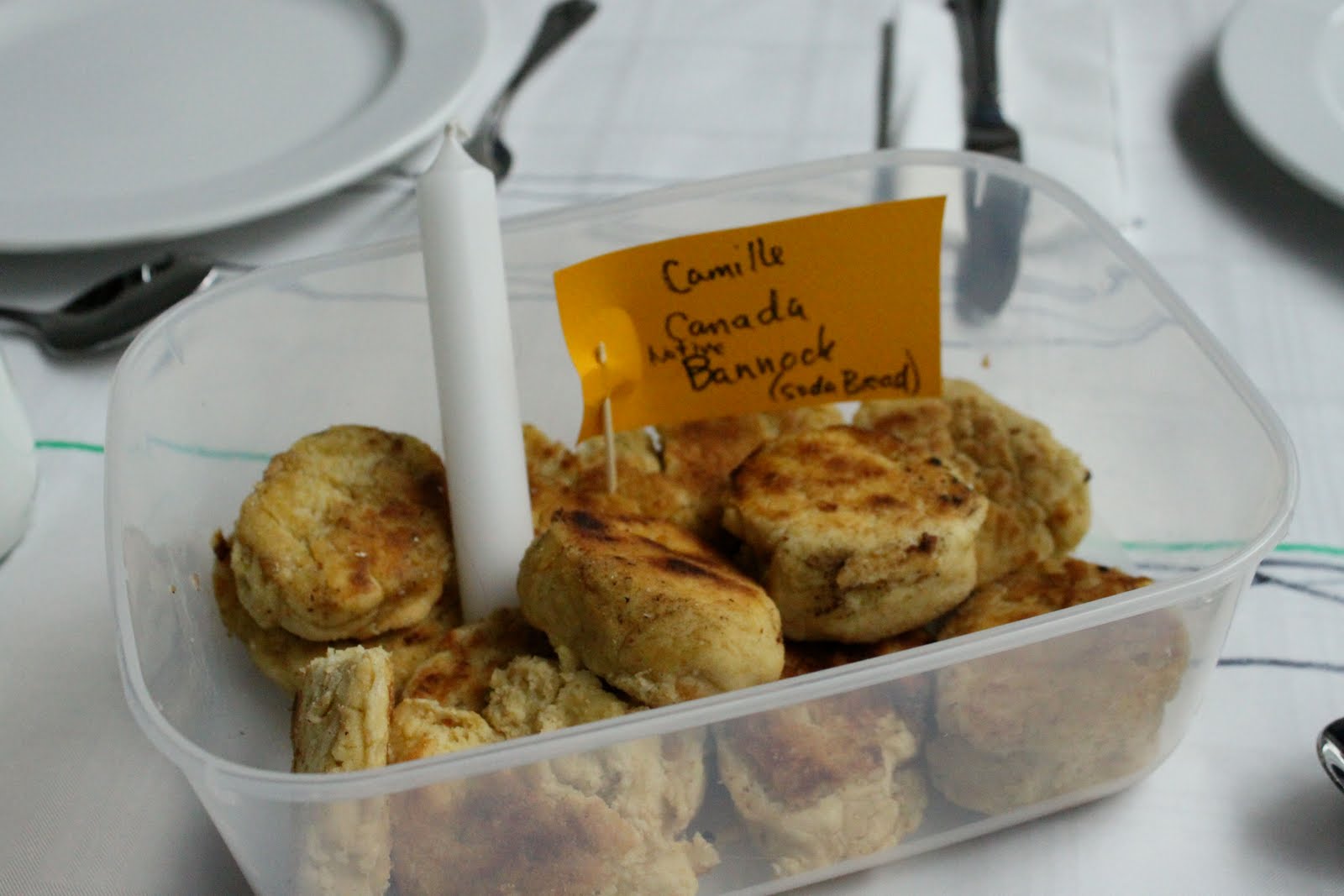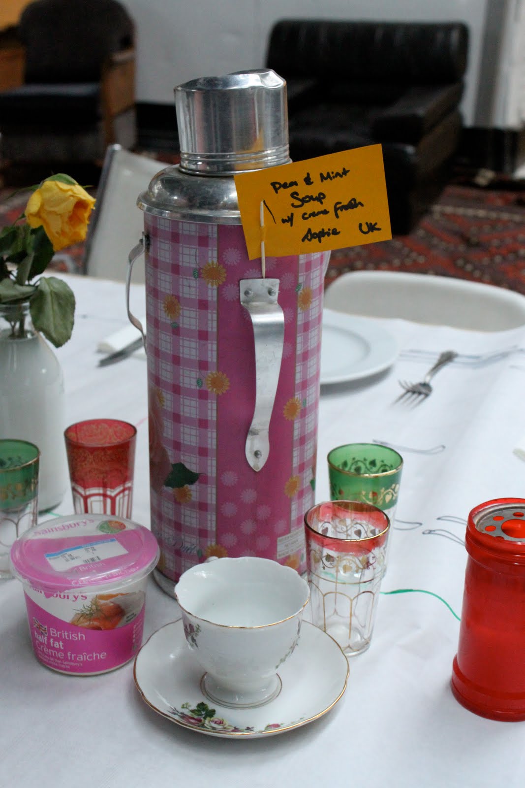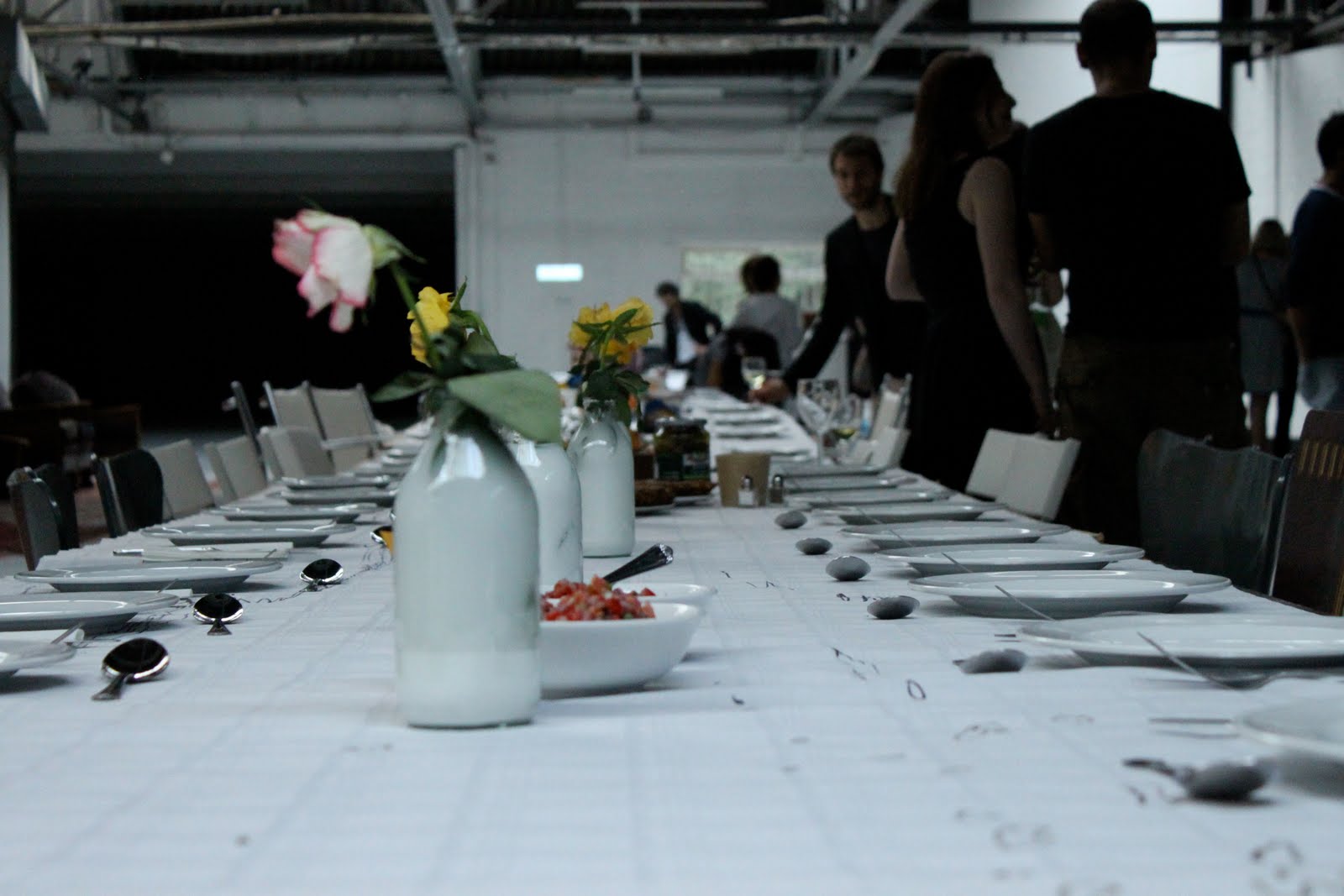 Alex Haw, organiser of Latitudinal cuisine, a weekly supper club where guests bring a dish, borrowed a large space at The Dairy in Kings Cross. He invited 100 guests, who were told to bring a dish from their country and a candle. Sourcing a thirty metre table and 100 chairs was no mean feat. The candles were lit as the light dimmed on a warm July day. Guests were given numbers three times during the meal, we changed places by seeking the corresponding number on the back of the chair.