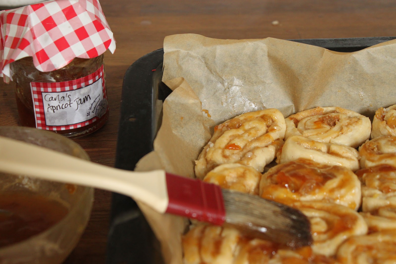 I made some Chelsea buns, using some Apricot Jam made by this bird. There’s a nice recipe by Sig, which learns yer ‘ow to make ’em.