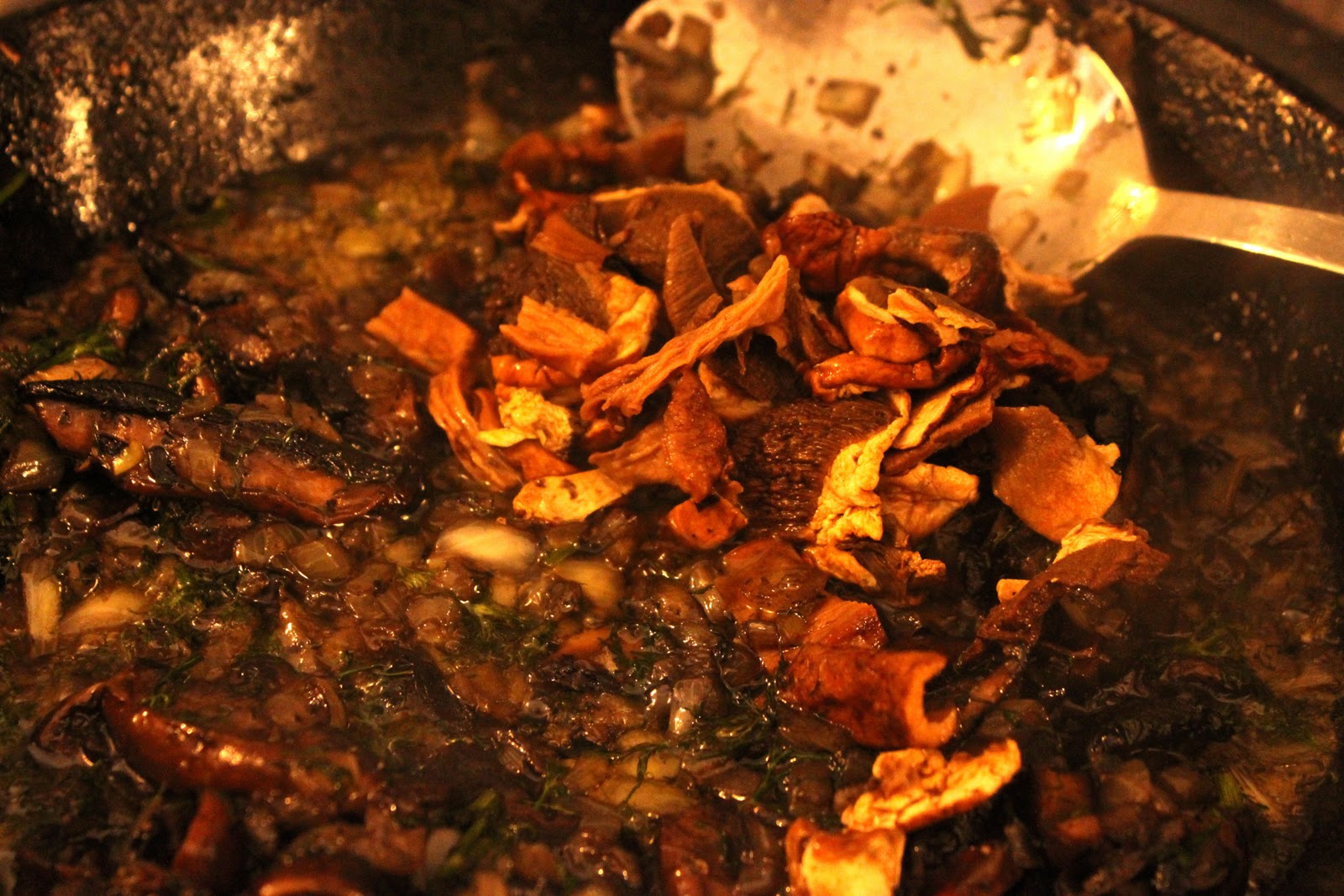 Wild mushrooms and onions fried in plenty of butter, the start of the stuffing for the cabbage