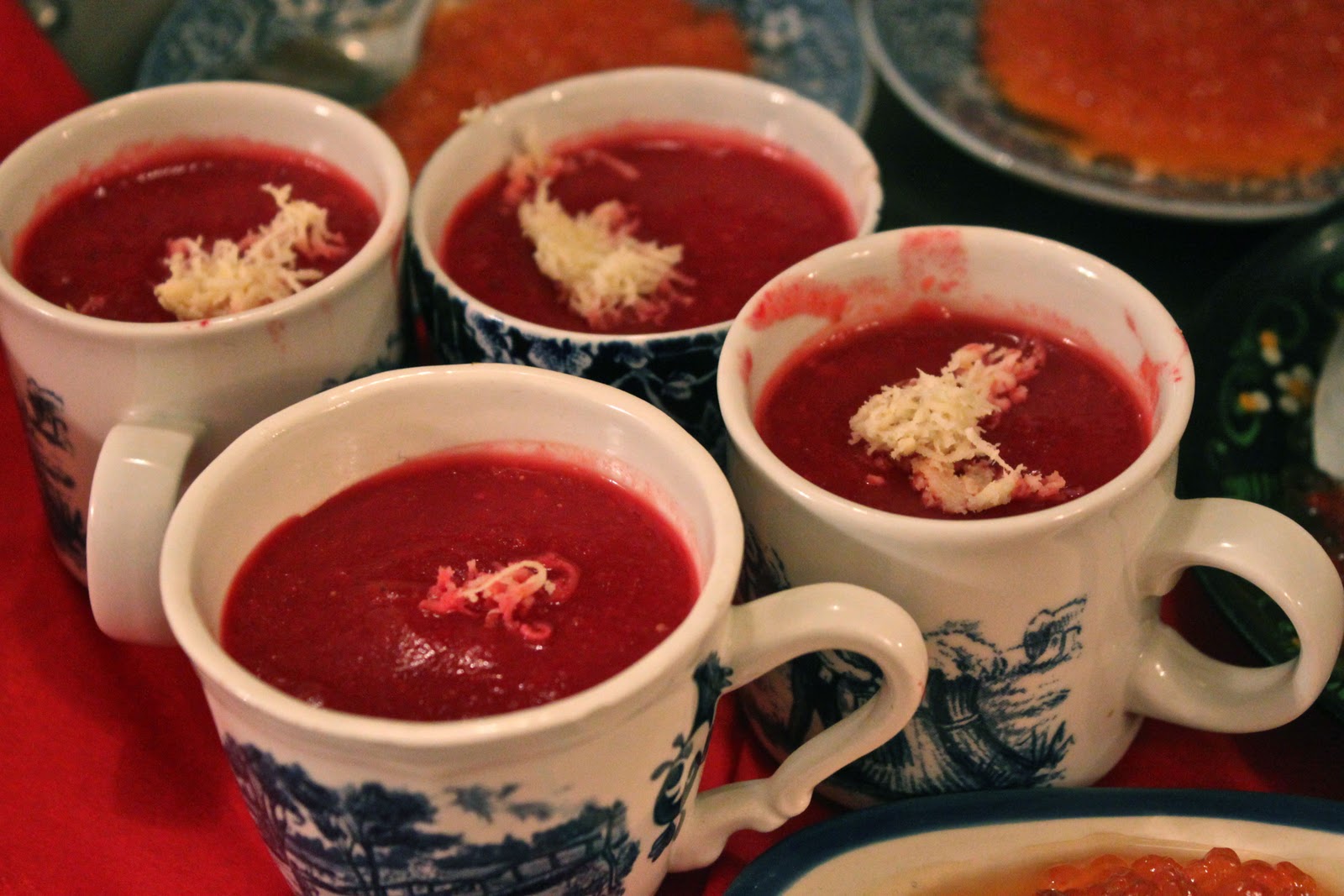 Carmine coloured borscht soup made by Katrina