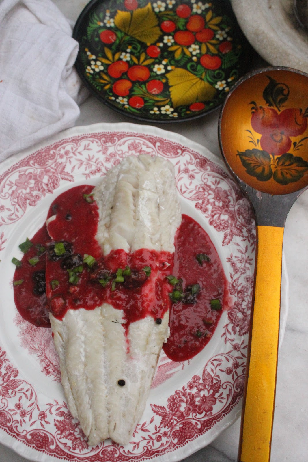 Topped with a cherry sauce. I took the recipe from this book A taste of Russia by Dara Goldstein. It’s hard to get sour cherries in this country and, as I had never tasted this dish, I just had to guess what it should taste like. I used dried sour cherries and sour cherries in jam. For many guests this was their favourite dish. To define it is difficult: like describing a new colour. It was sweet and sour which contrasted nicely with the meaty pale fish. I couldn’t get hold of sturgeon which is rather boney and prehistoric looking, so I used another typical Russian fish..’pike’ or ‘zander’.