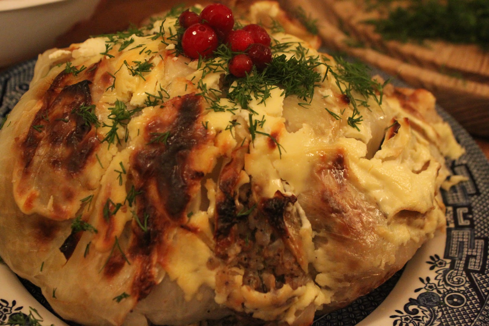 Another adapted recipe from A taste of Russia: whole stuffed baked cabbage. As the original recipe was with meat I made up my own recipe.