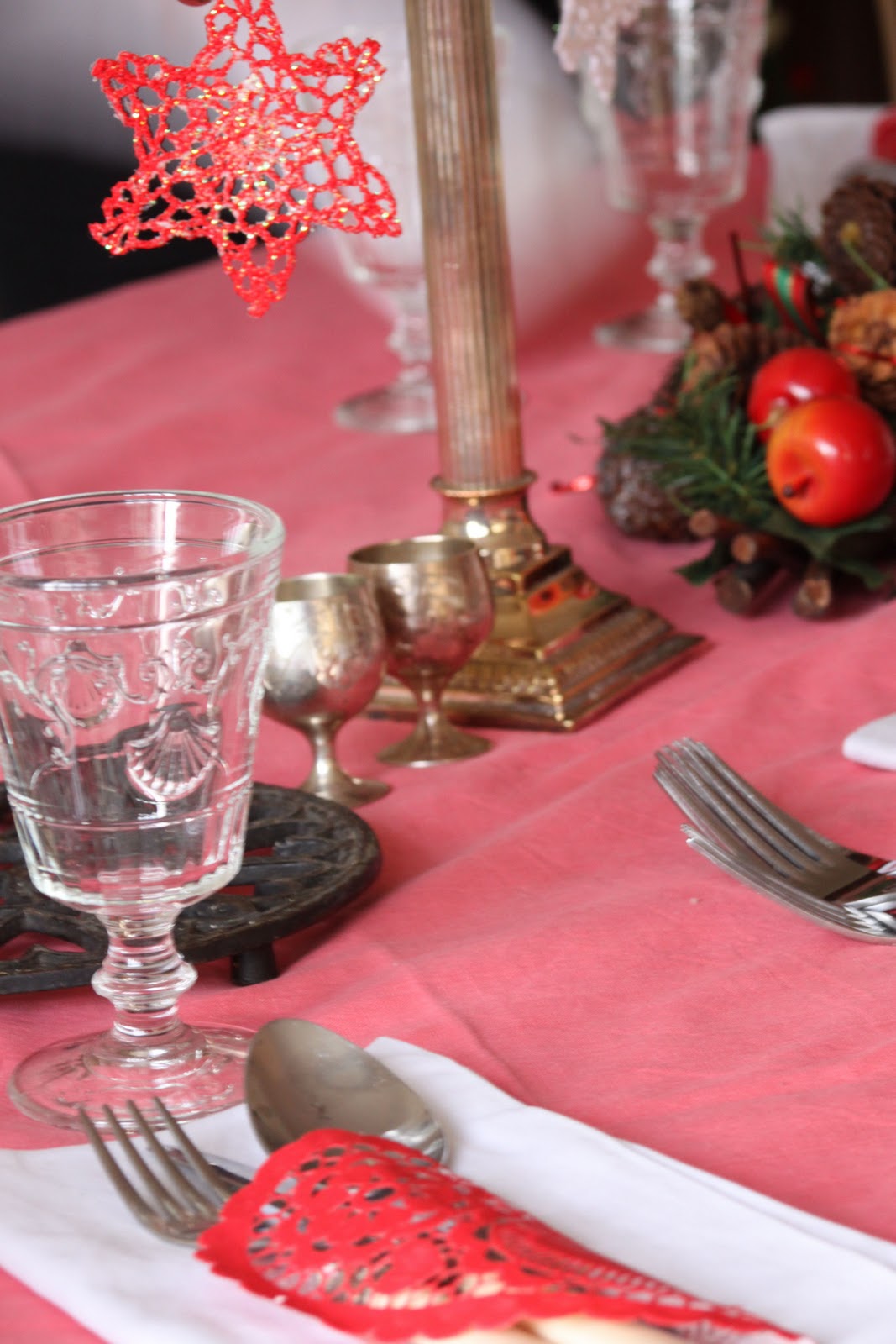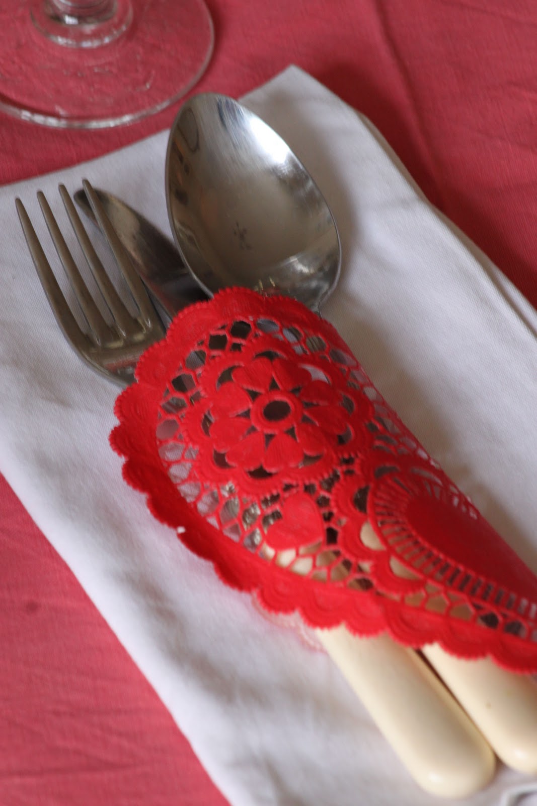 We made this decorative cutlery wrap by glueing together red heart shaped doilies from Lakeland.