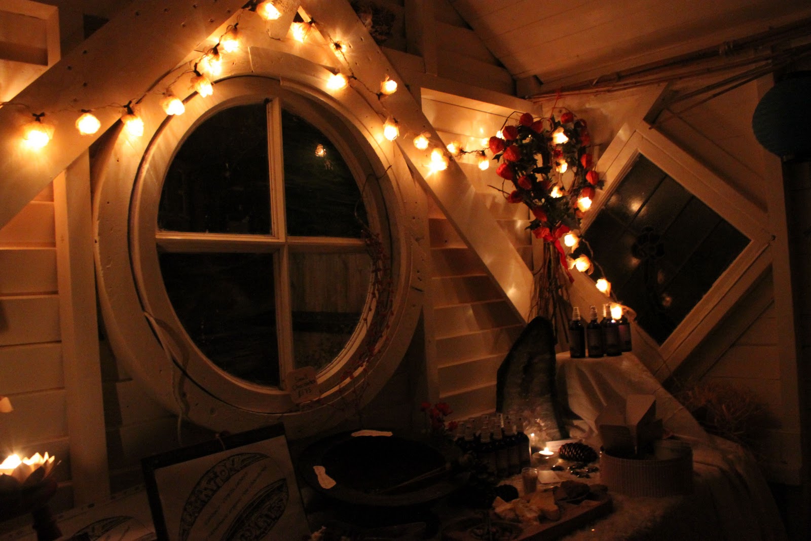 The shed at night: the garden looked very pretty as night fell, twinkling candles and a flickering bonfire.