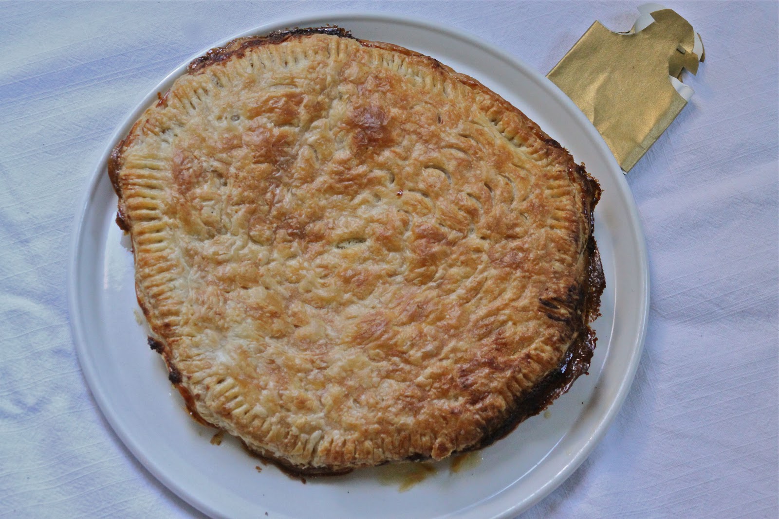 Then lay the other circle on top, sealing the edges with a fork. You could then carve designs into the top, taking care not to pierce the pastry. Make a little slit in the middle to let steam escape then brush the top with the egg yolk.