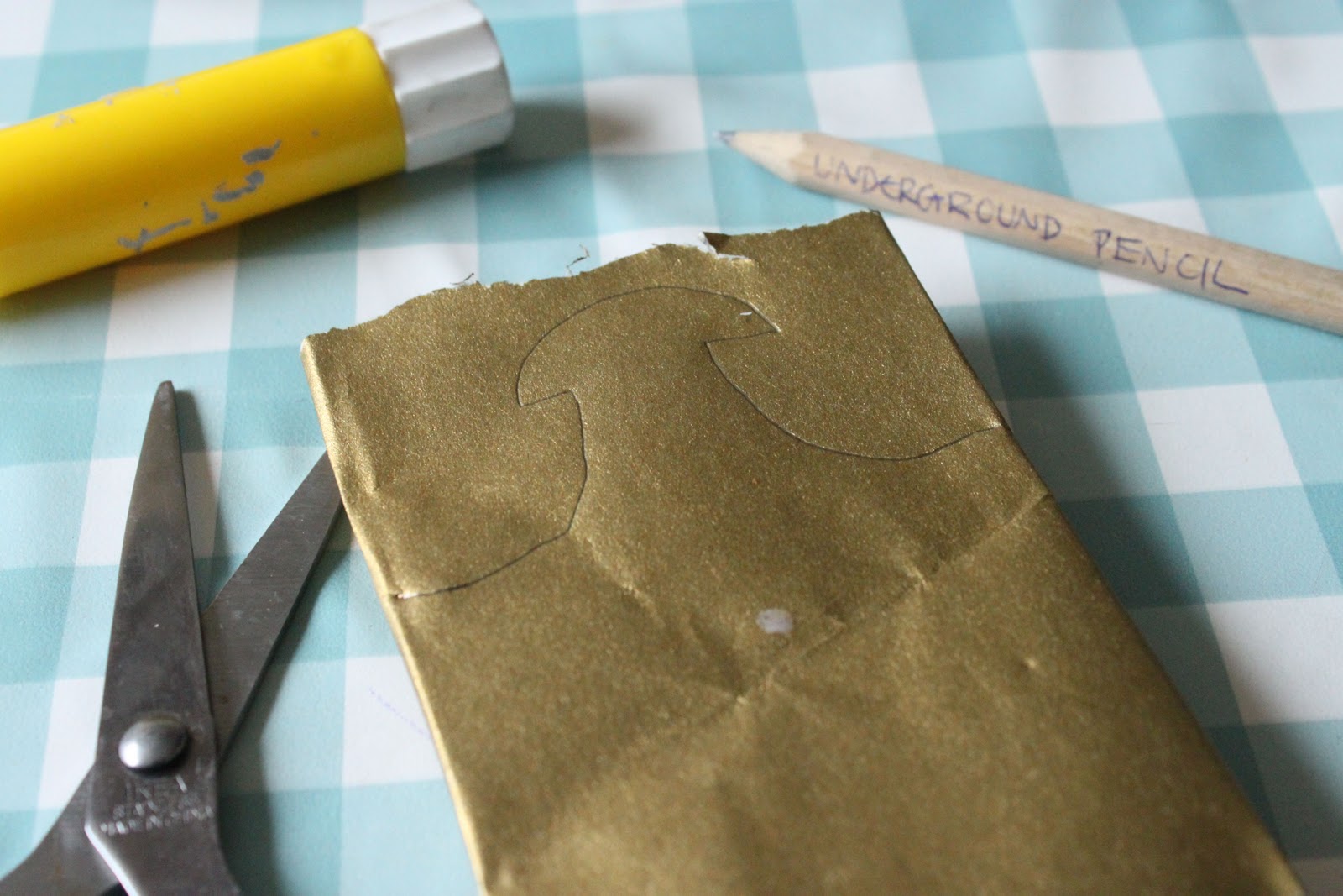 To make the crown cut a strip of gold or silver paper, enough to fit the circumference of the average head. I pleated the strip of paper and drew the shape of one of the points on a crown. I then cut out the shape. Unravel and glue the short edges either end together.