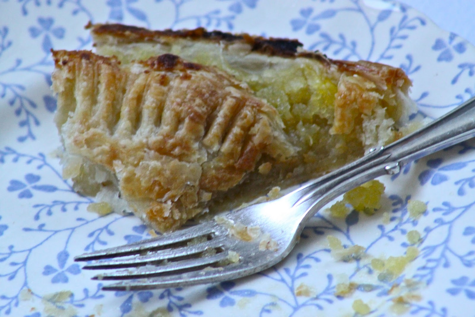 Every January in France however, patisseries will sell a ‘galette des rois’, cake of kings. Children love these almond croissant style pies for, if you find the little china figurine of a king in your slice, you get to wear the crown and become king for the day. In some versions of this epiphany dessert, you will find a bean instead. I, lacking a bean (“I haven’t got a bean”) and a figurine used a walnut instead. I didn’t have a crown either so made one out of a scrap of gold paper.