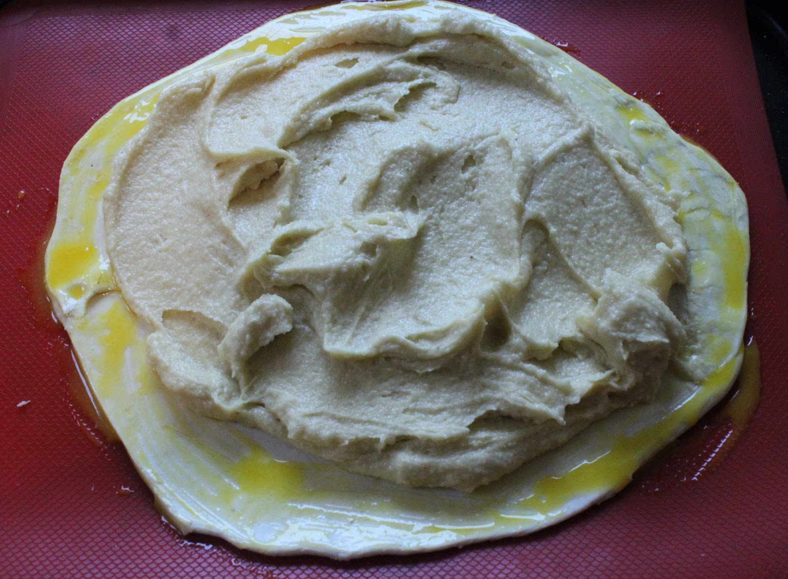 Lay one circle on a silicone mat on a baking tray and fill with the almond cream leaving a 3 cm border around the edge. Paint the border with the egg.