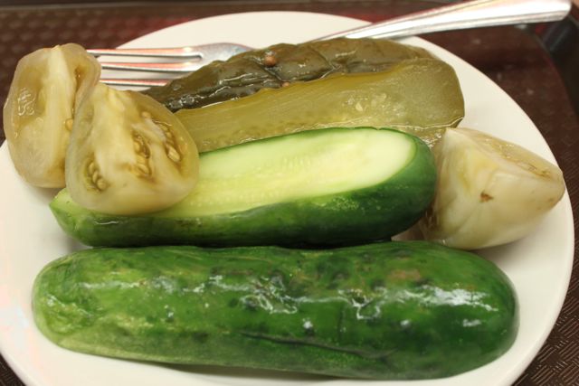 I ordered a bagel with lox and cream cheese with a side of sour and semi sour pickled cucumbers and pickled tomatoes. Mr Katz explains to me that the cured meats they have on the wall, they are not allowed to sell. “People have been curing meat for hundreds of years, but the New York health department say this is risky. I have to keep them refridgerated. Those on the wall are just for decoration. The health laws in New York are stricter than anywhere else.”
