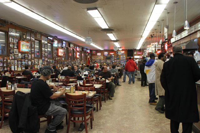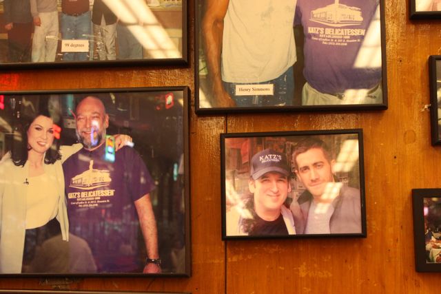 Katz’s Delicatessen, New York’s oldest deli, has a homely and sprawling dining room, the walls jumbled with photographs of celebrated visitors including presidents. As you enter, two unnerving black bouncers, bottoms spreading cartoon style over their stools, crackle at you: “take a ticket, order your food, sit down, pay on the way out” so quickly I had to ask them to repeat it. Which they did with a surprising smile.