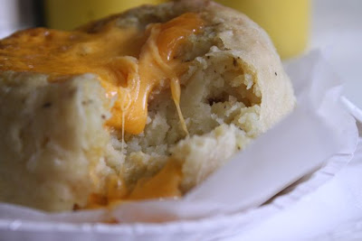 Potato knish with cheddar and mustard