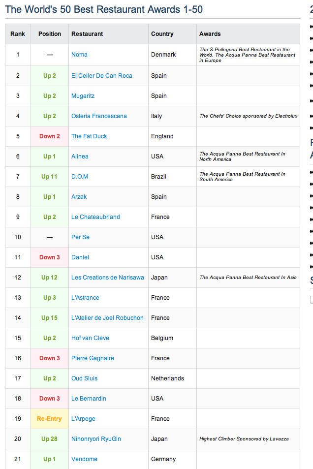 I’m not sure what to think about the special prize for ‘Best woman chef’ won by Anne Sophie Pic, whose restaurant was number 74 on the list. It seems a little patronising. It remains a fact that top women chefs are still a rarity in a world where long hours and evening service preclude those who have primary responsibility for rearing children. Maybe positive discrimination is the way to go… women-only lists are the reason we now have more female MPs in parliament. It doesn’t look like things will change anytime soon as Bruce Palling’s ten upcoming chefs’ list for the Wall Street Journal features only men.