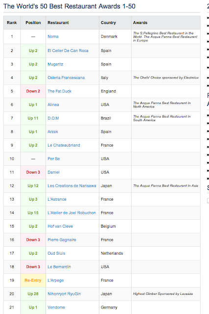 Ultimately it’s really rather absurd to have a top 50 list for restaurants, how can you compare food in that way? It makes such a difference to the chosen restaurants: I met Claude Bosi, whose restaurant, Hibiscus in London, last year achieved 49th place. Bookings rose, he told me. This year Hibiscus moved up the rankings to 43. Last year, when Noma won the number one spot for the first time, they received 100,000 requests for bookings overnight.