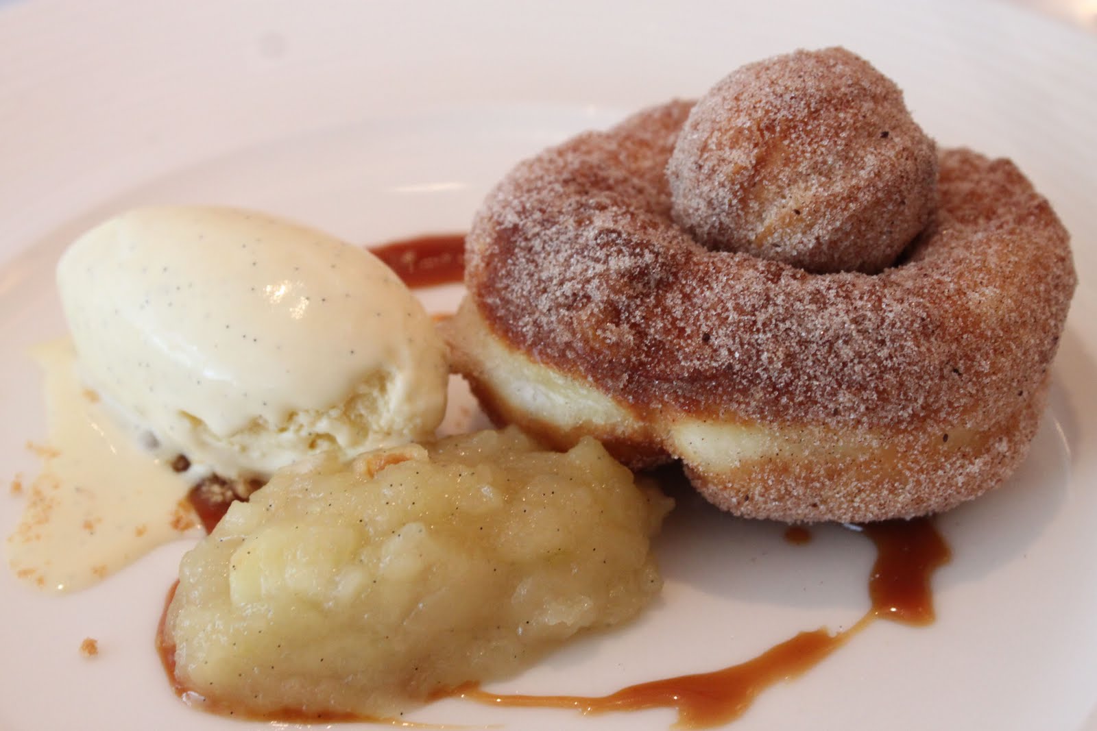 Cinnamon doughnut, apple sauce, vanilla icecream, dribble of toffee sauce: fantastic. Are doughnuts the new black?