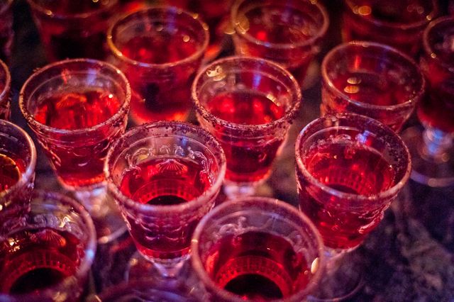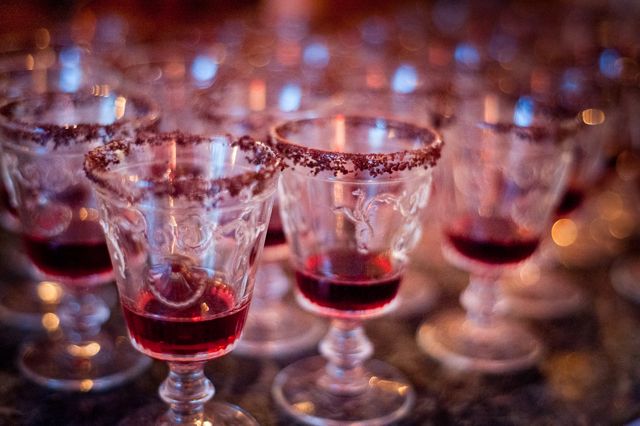 Creme de mures with vermouth, white wine and a dusting of dark chocolate around the rim.